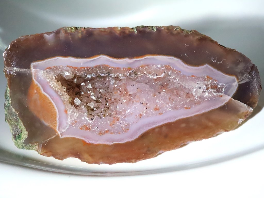 Lem (okraj) achátu je čirý a průsvitný. Prostředek achátu je pak bohatě vyplněný ledovým křišťálem. Ten zde tvoří dokonce tzv. dutinku s drobounkými špičkami.