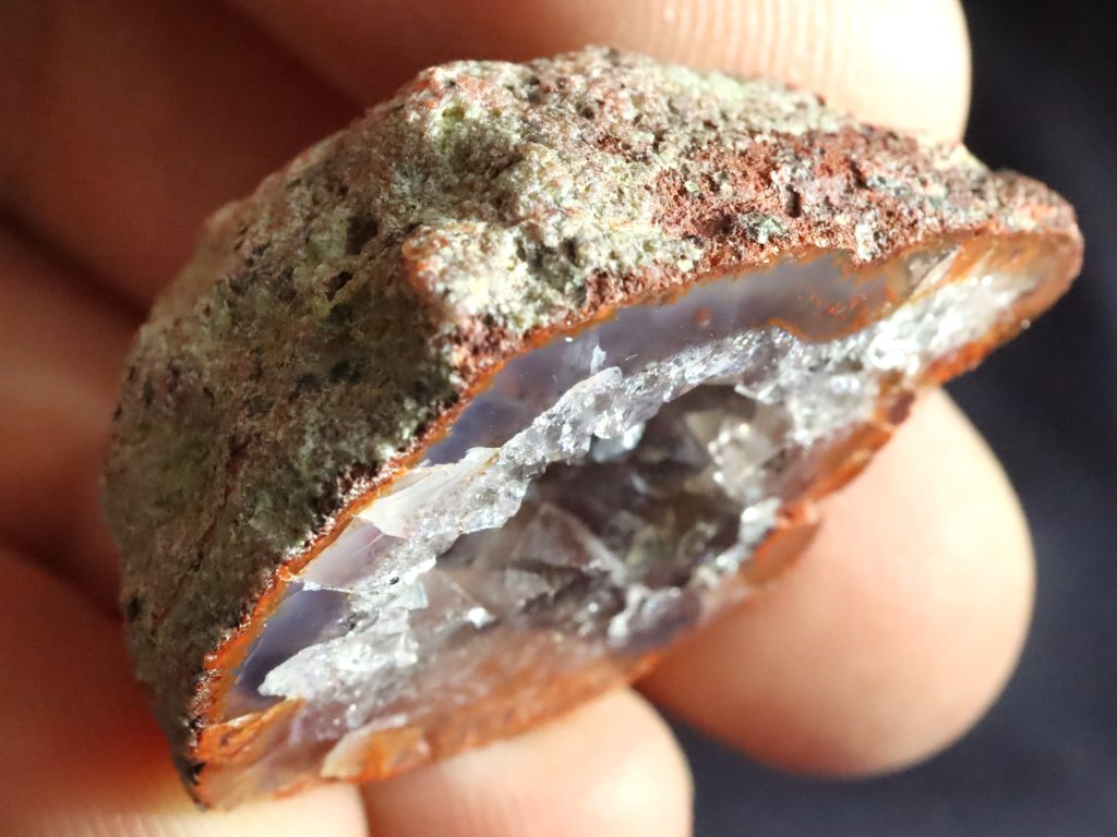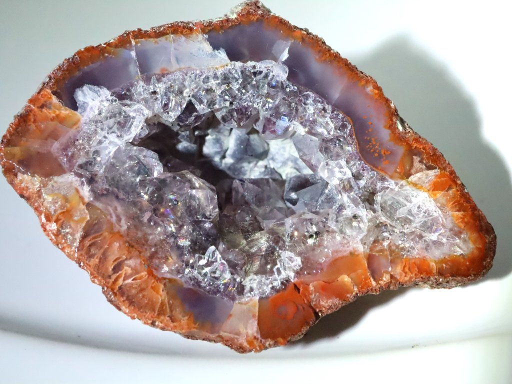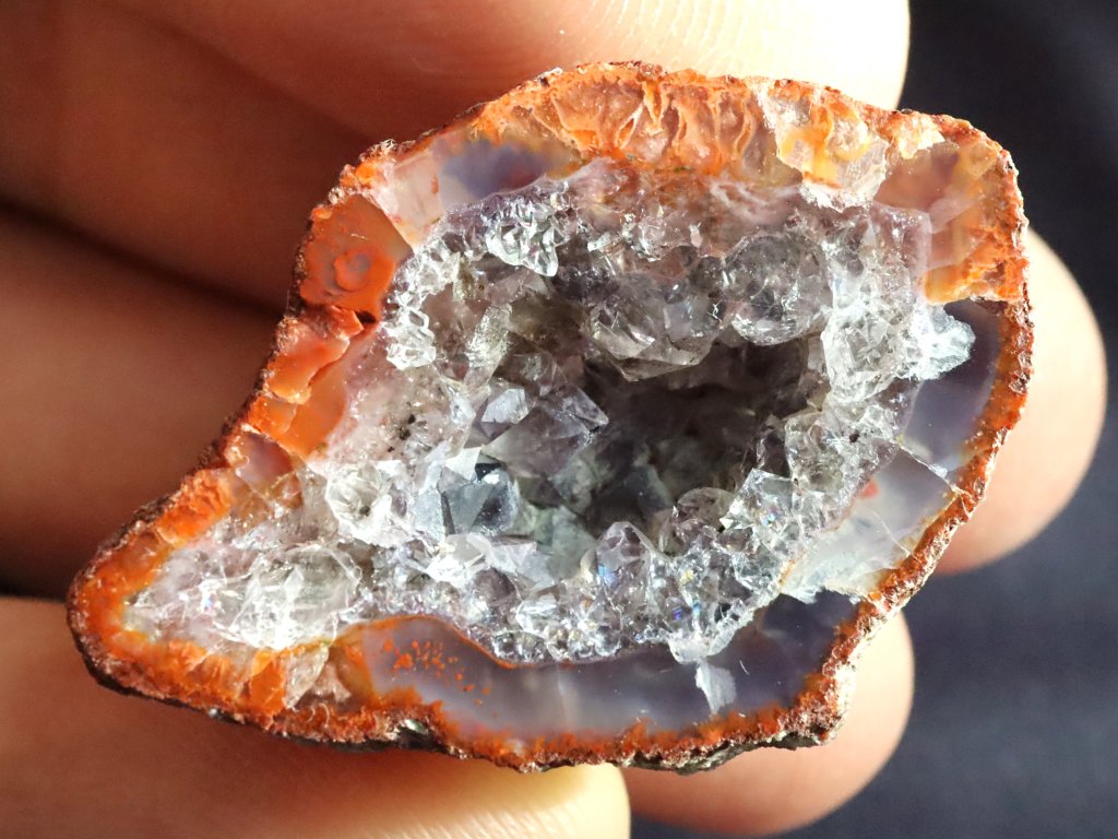 Lem (okraj) achátu má hezký oranžovo-fialový odstín. Prostředek achátu je pak bohatě vyplněný ledovým křišťálem. Ten zde tvoří dokonce tzv. dutinku.