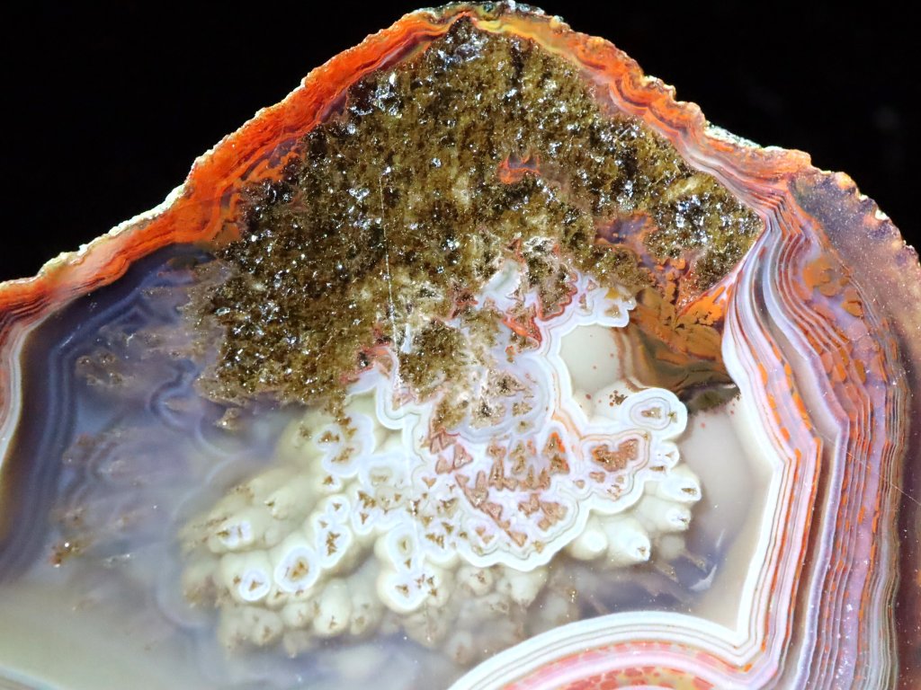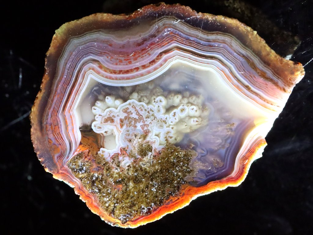 Tato vyleštěná polovina achátové pecky z Doubravice sice nepatří mezi ty největší, může se však pochlubit krásnou kresbou i netradiční výplní středu.