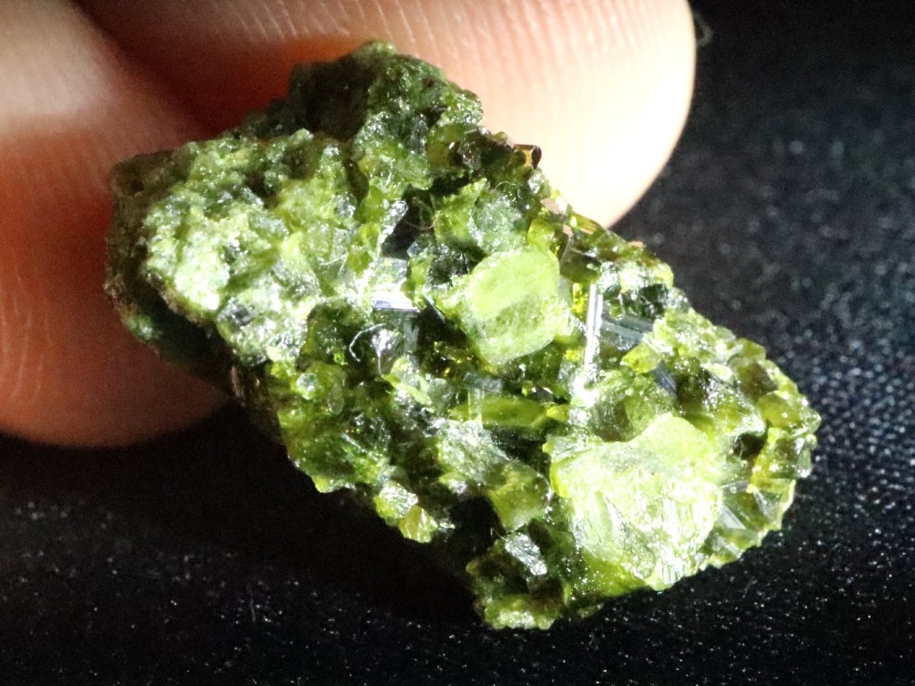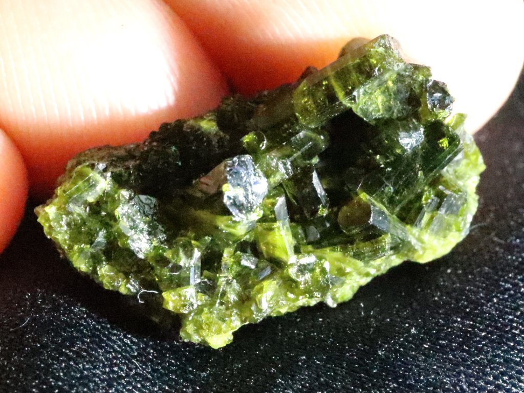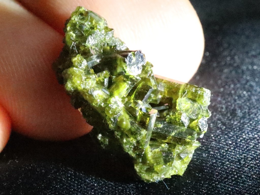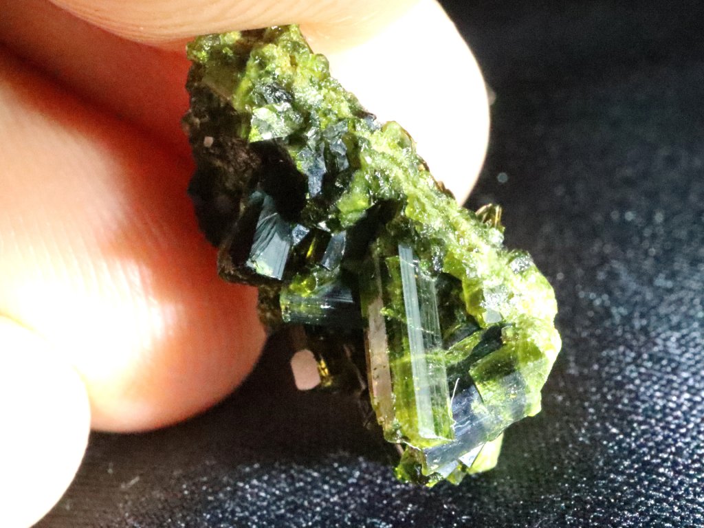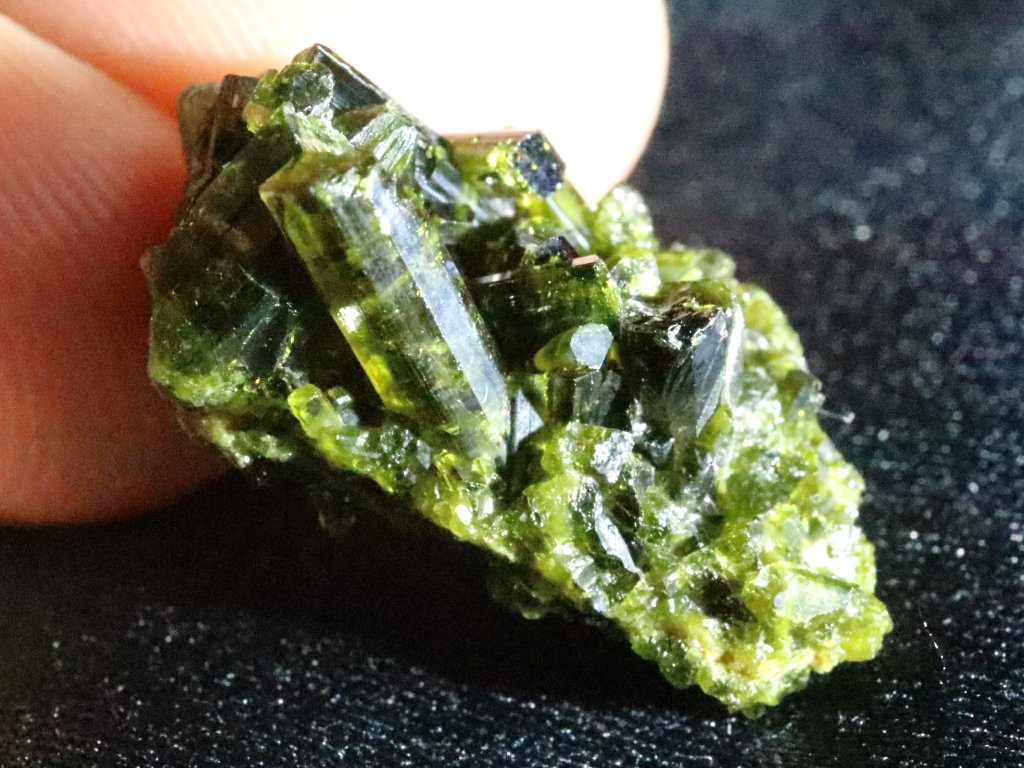 Epidoty mají na běžném denním světle či ve stínu temně zelenou barvu. Pokud však krystalky prosvítíte/nasvítíte sluníčkem nebo lépe silnou baterkou, rozzáří se nádherným olivově až brčálově zeleným odstínem a kamínek rázem působí skutečně úžasným dojmem.