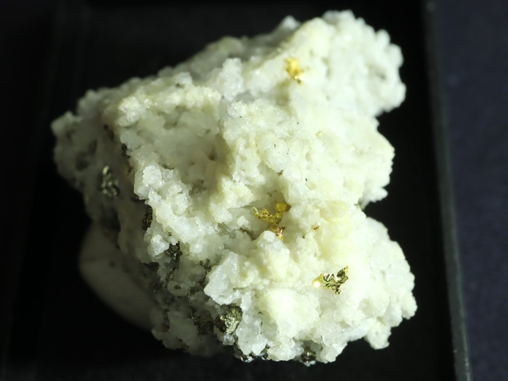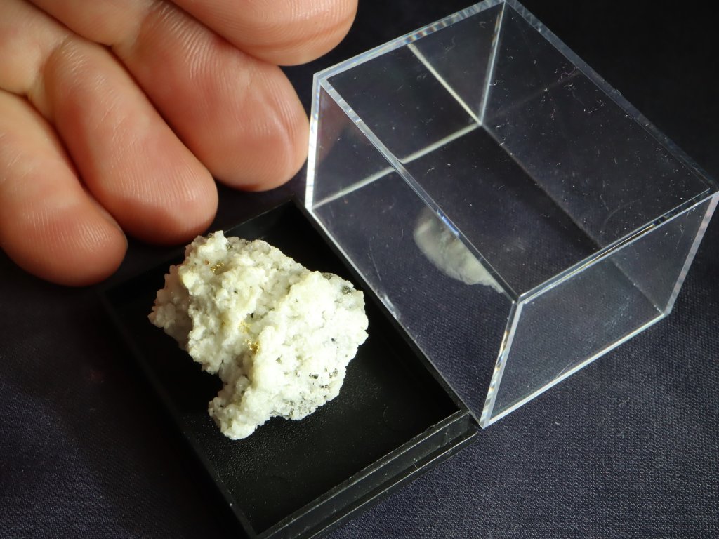 Součástí tohoto zlata je i plastová krabička (rozměr 42 x 32 x 28 mm - délka, šířka, výška), kterou můžete vidět na fotografiích. Vzorek je k plastovému podstavečku uchycený pouze pomocí mineralogického tmelu (plastelíny) - viz. popis níže.