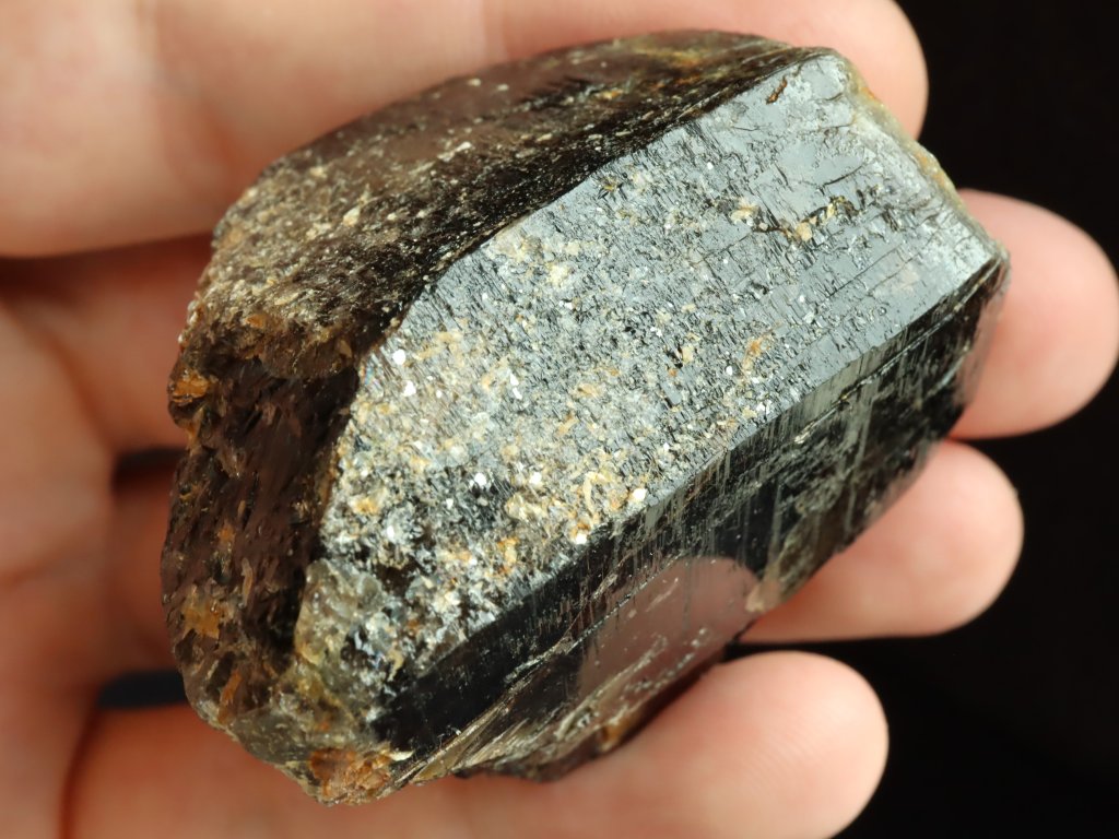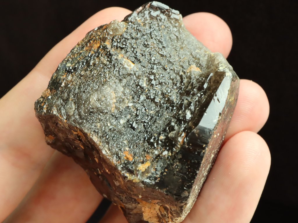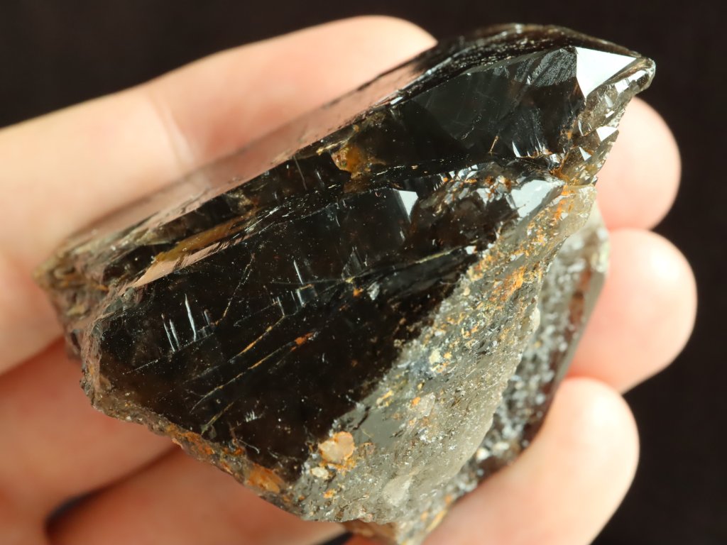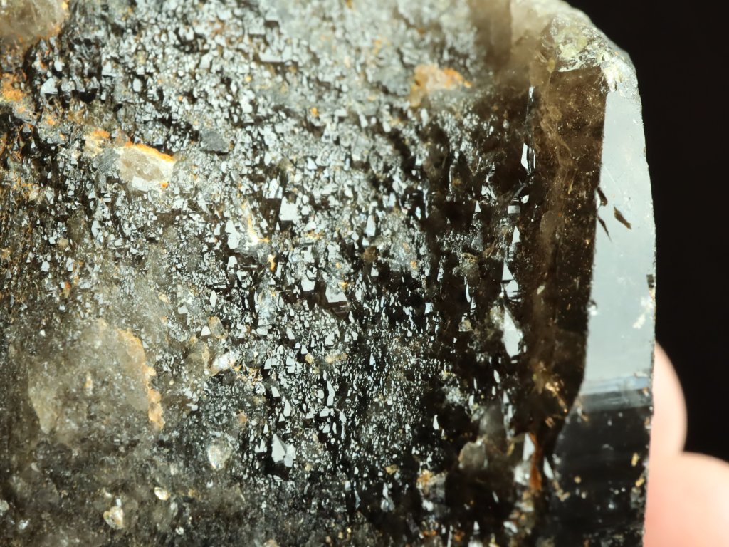 Ze zadní nepohledové strany se pak klasické krystalové plochy sice nenachází, ale morion je zde krásně tzv. dohojený množstvím drobounkých plošek a špiček - Toto dohojení je dobře patrné z některých detailních fotografií.