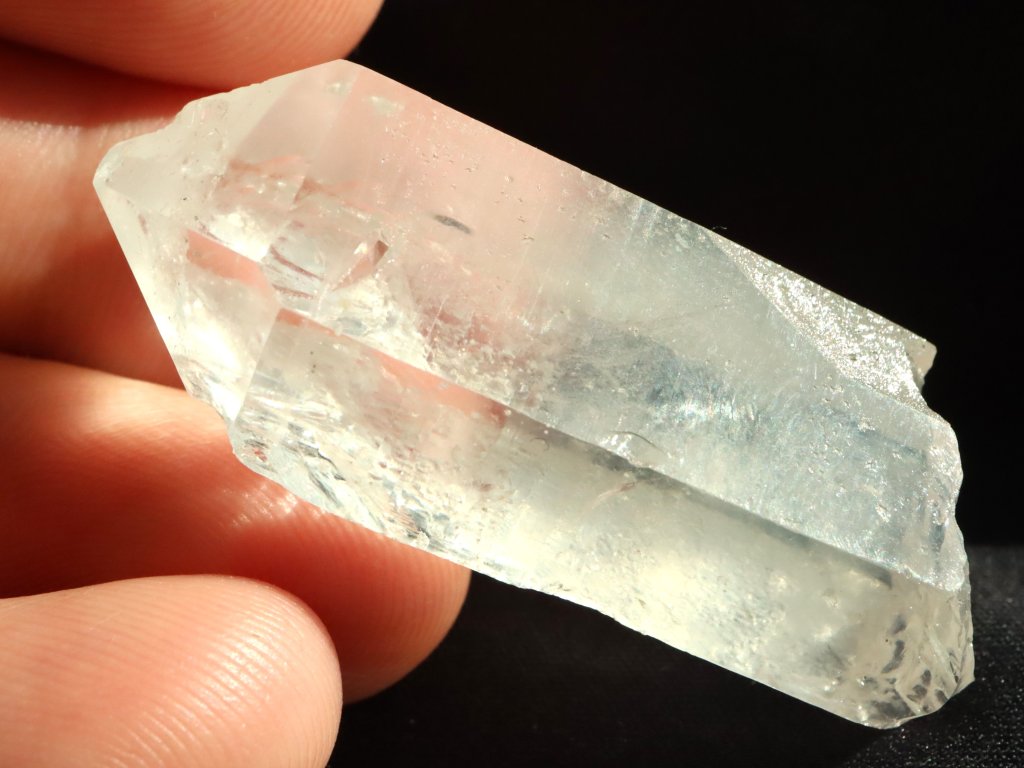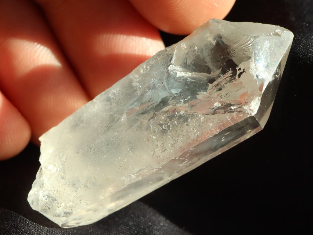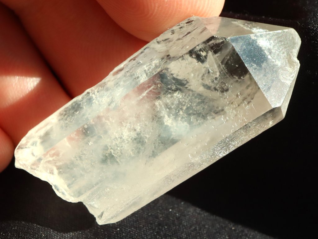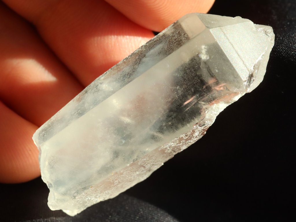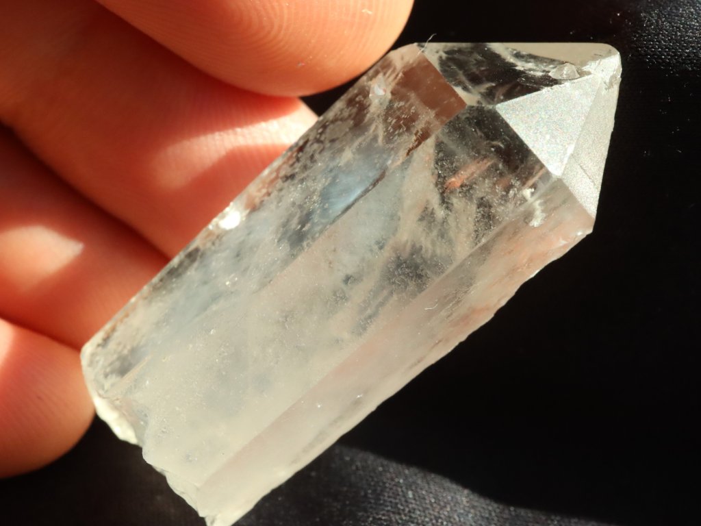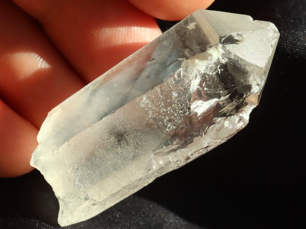 Křišťál je z pohledové strany lesklý, a tak při jeho prosvícení sluníčkem či baterkou můžete krásně nahlédnout do jeho skromného vnitřního světa. Tam se mimo vysoké až drahokamové čistoty ukrývá i několik peříček či mlhovinových závojů.