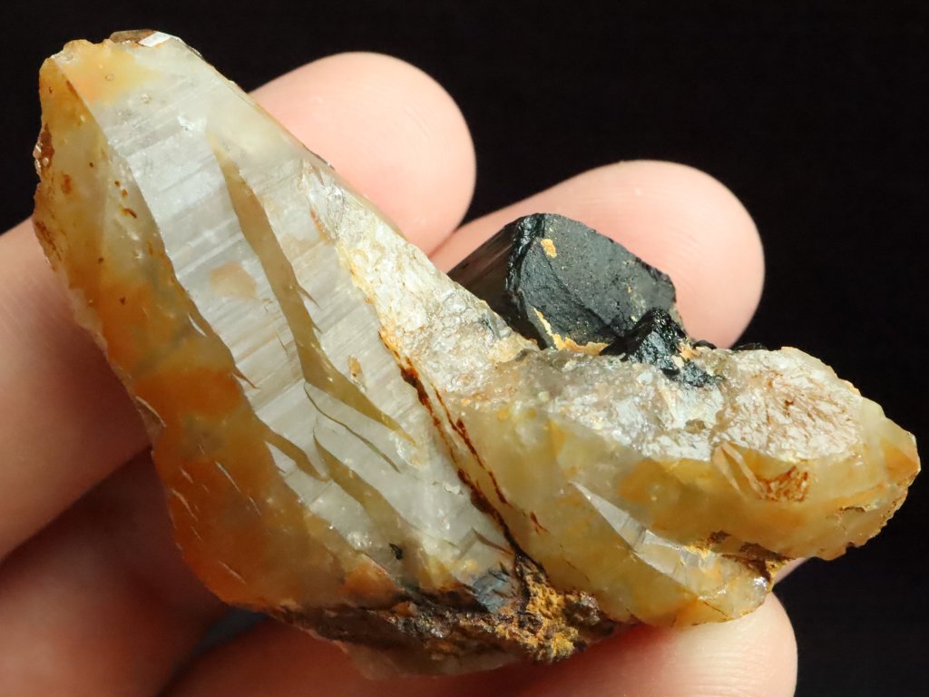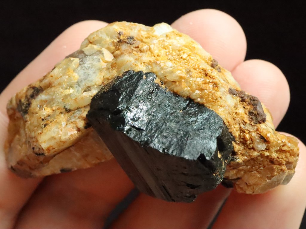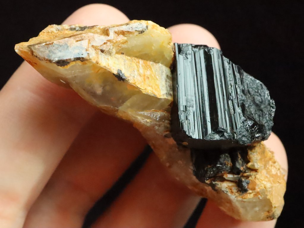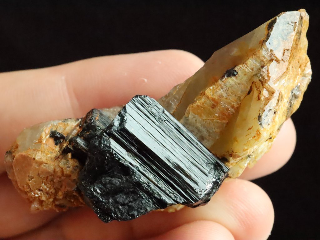 Nejkrásnější je tu však zarostlý špalík černého turmalínu s pěkným leskem a typickým jemným rýhováním.