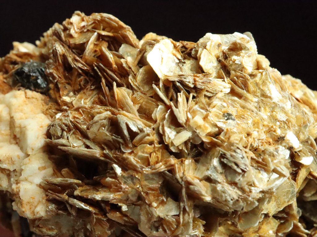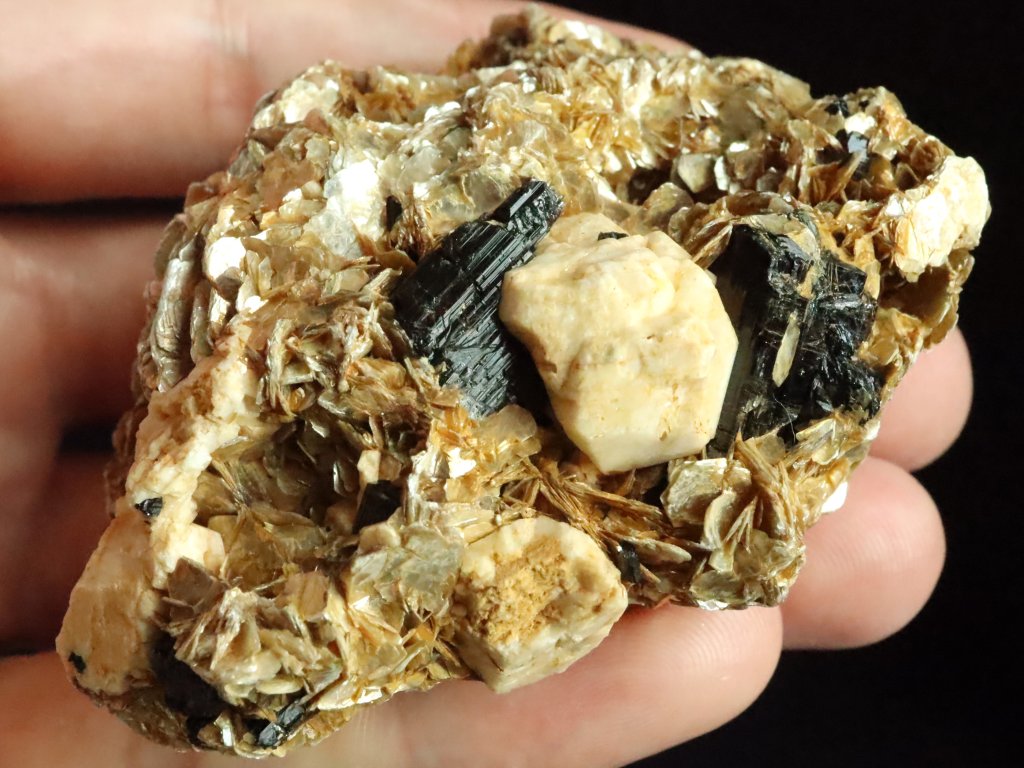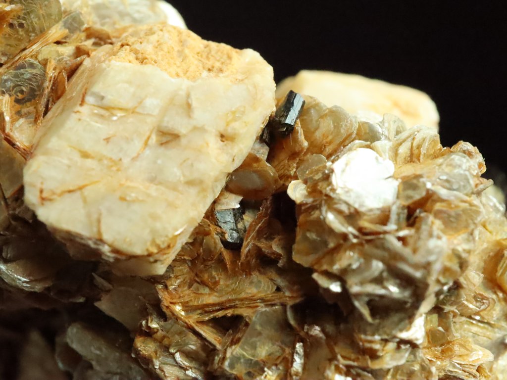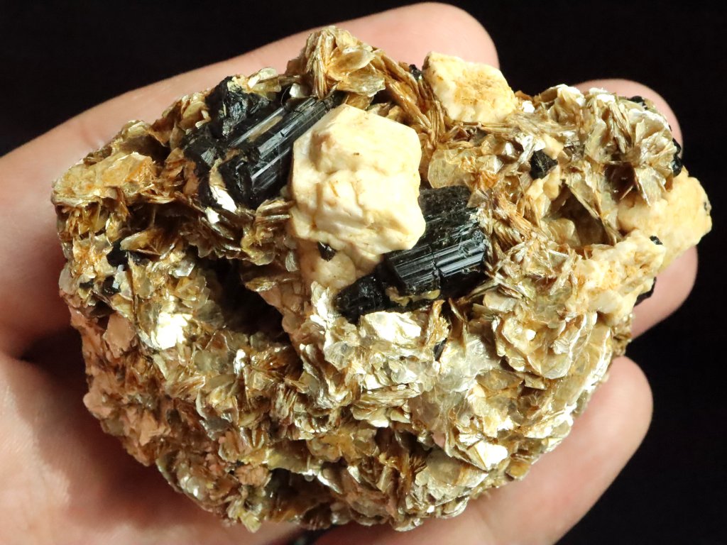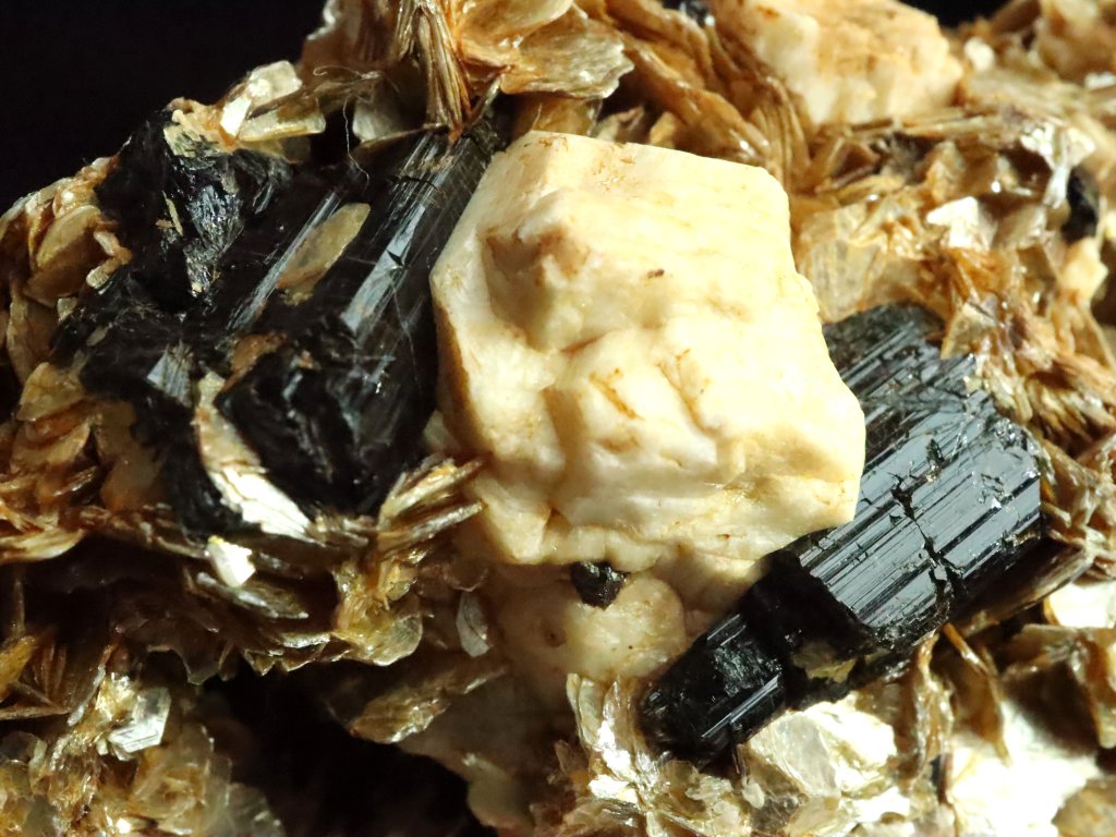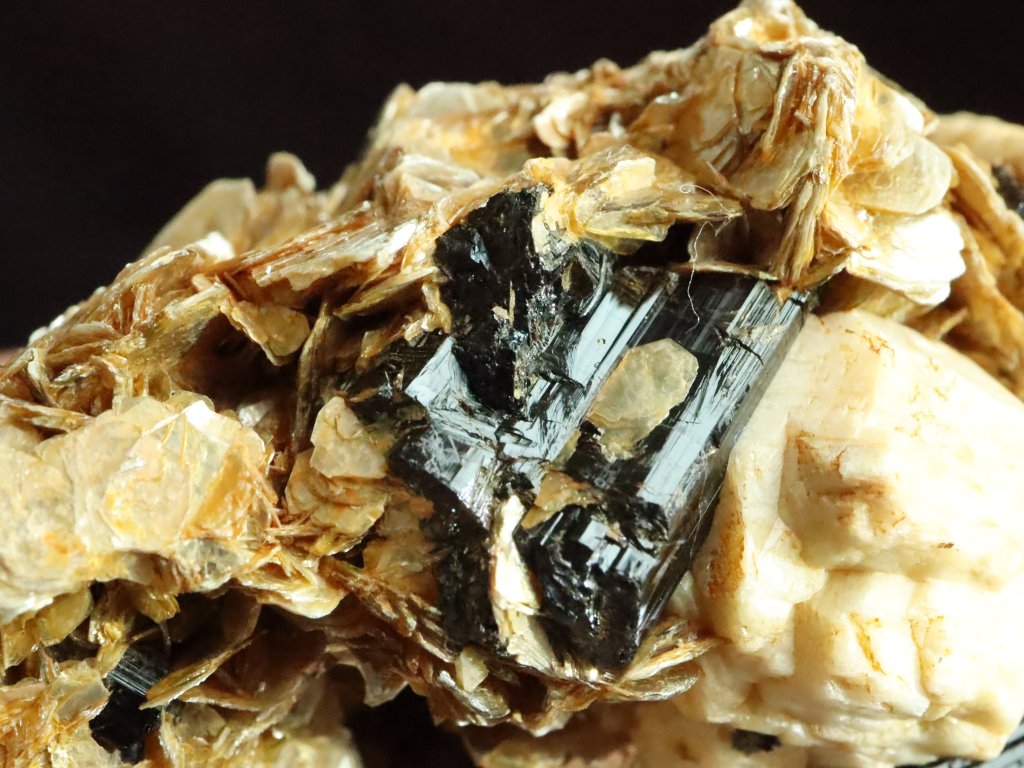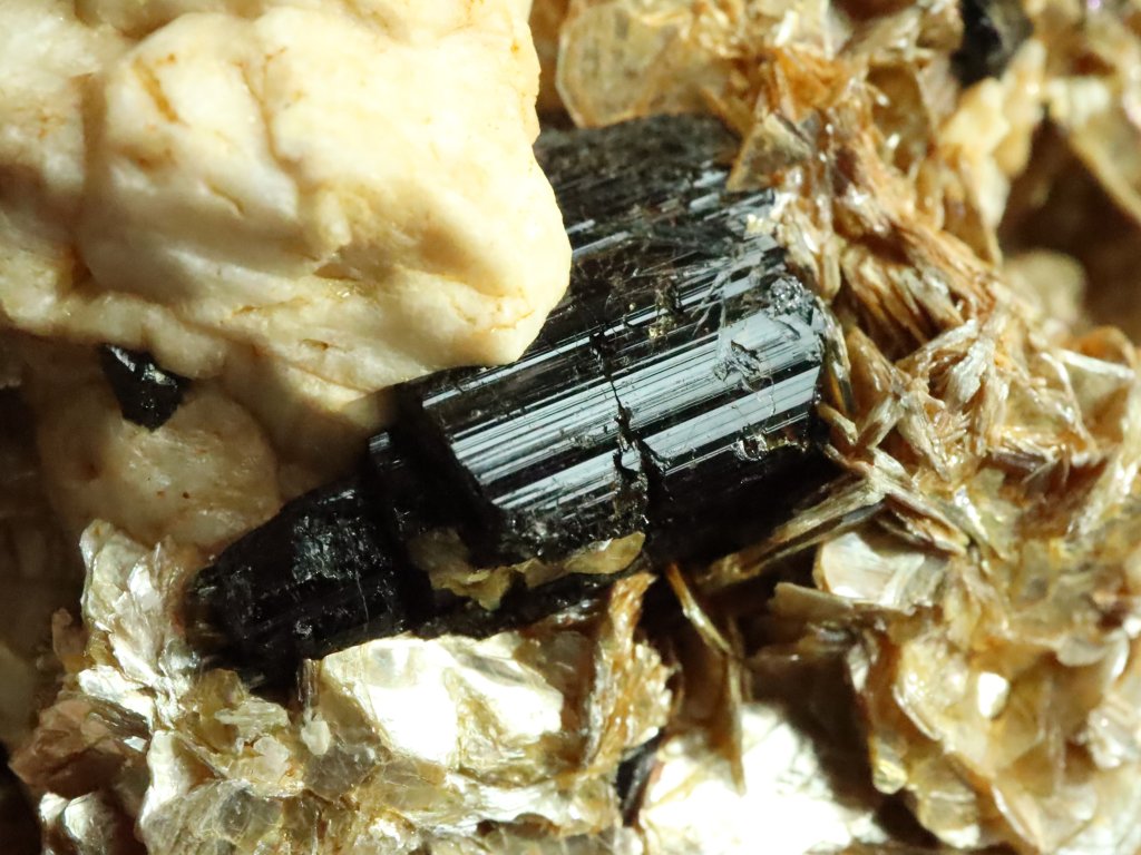 Černý turmalín zarostlý ve větším estetickém bloku lupenitého muskovitu