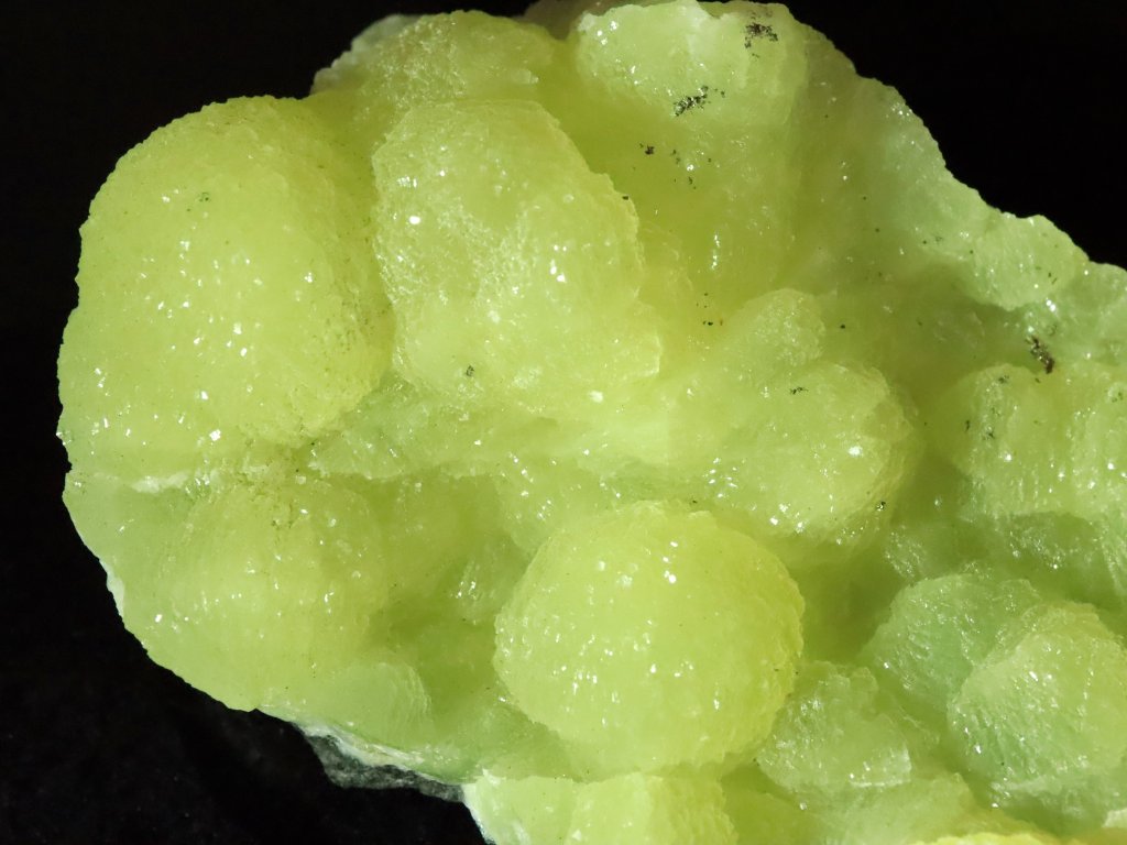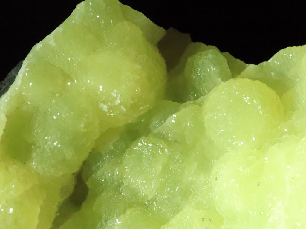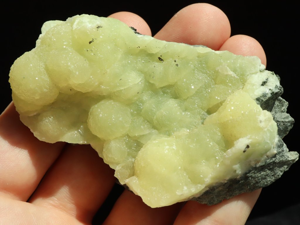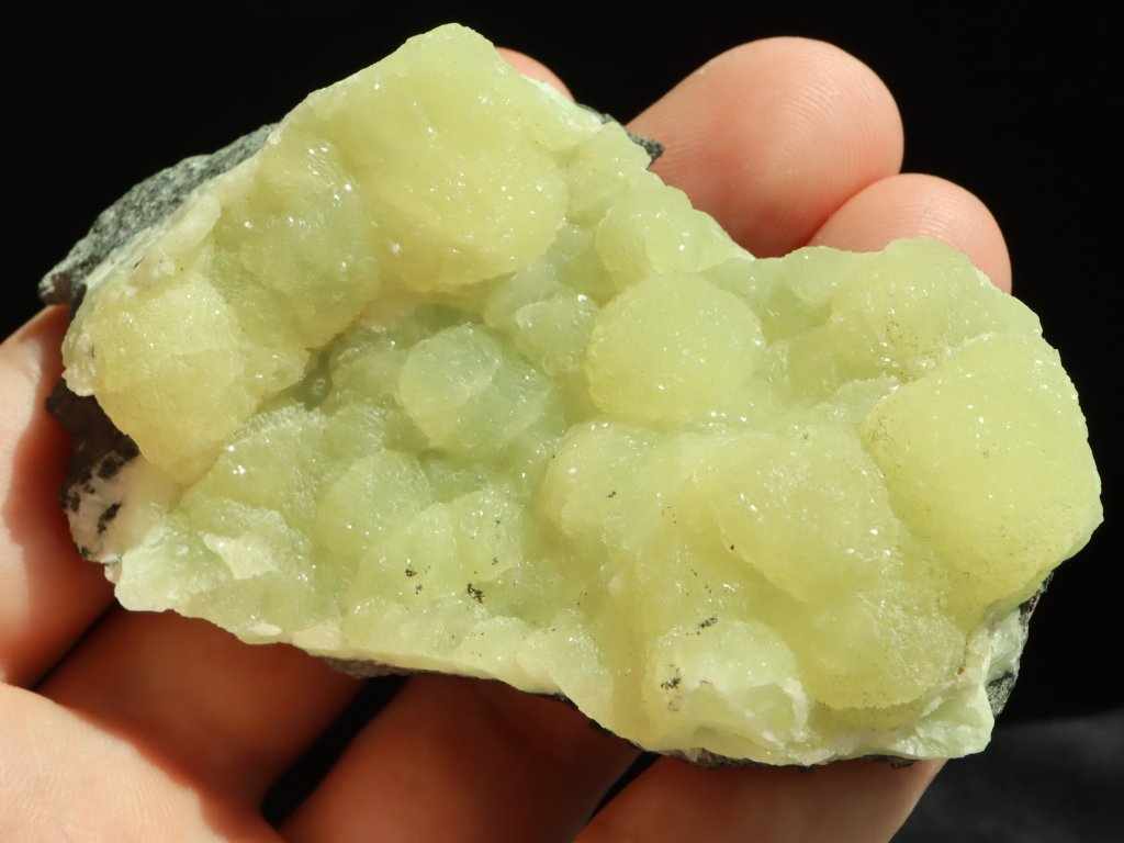 Jedná se o estetický vzorek, kde můžete z pohledové strany obdivovat krásné polokulovité tzv. ledvinité agregáty / útvary žluto-zeleného prehnitu s perleťovým leskem.