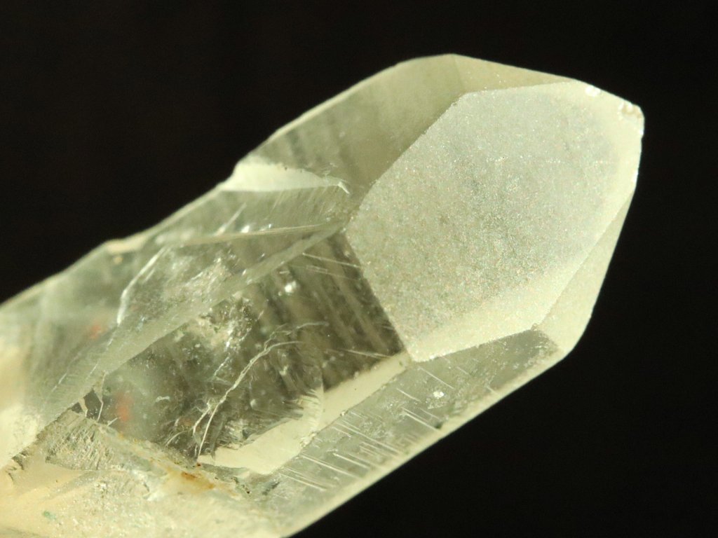 Zajímavé jsou však i obvodové stěny krystalu. Ty v některých pasážích nejsou klasicky hladké, ale mají v sobě drobné Klíčové otisky a vtisky (otlaky od sousedních krystalů). Nevšední je i náznak dalšího krystalku křišťálu zarostlý v jedné ze stěn.