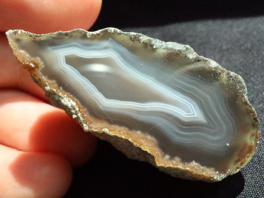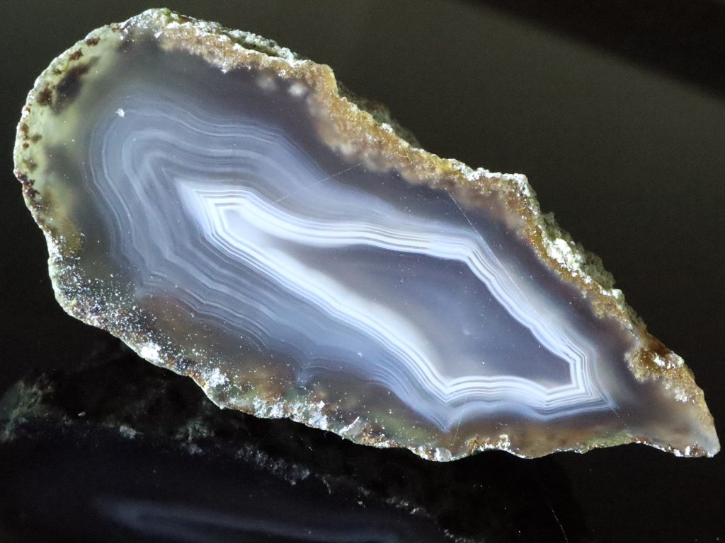 Seříznutá a vyleštěná polovina achátové pecky s nevšedním čirým bezbarvým okrajem a bílou kresbou s jemně modrým nádechem uvnitř.
