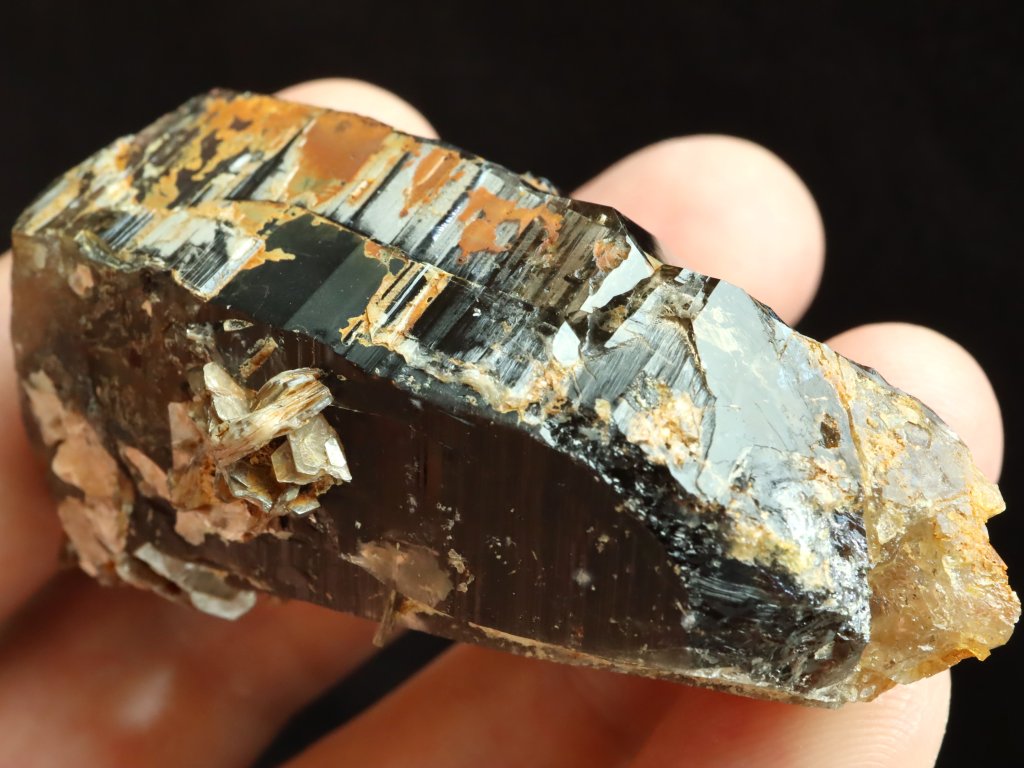 Na povrchu je pak morion v jedné pasážti zdobený lupínky stříbrné slídy (muskovitem). Za zmínku však jistě stojí i pěkná decentní patina oranžového limonitu (povlak).