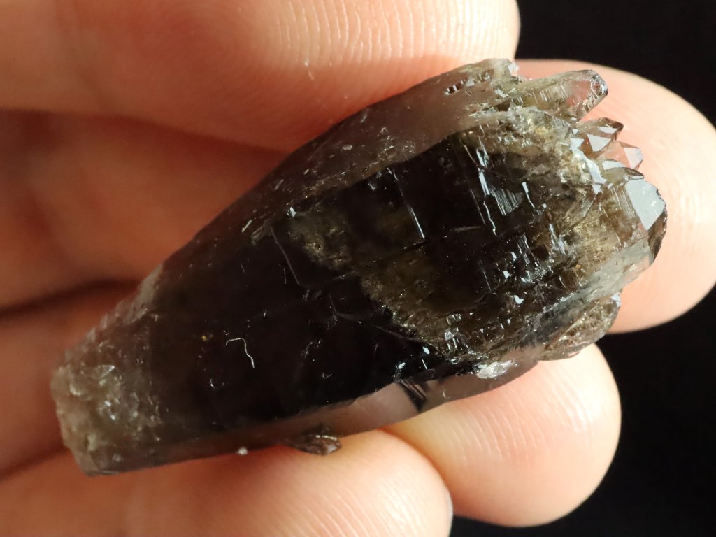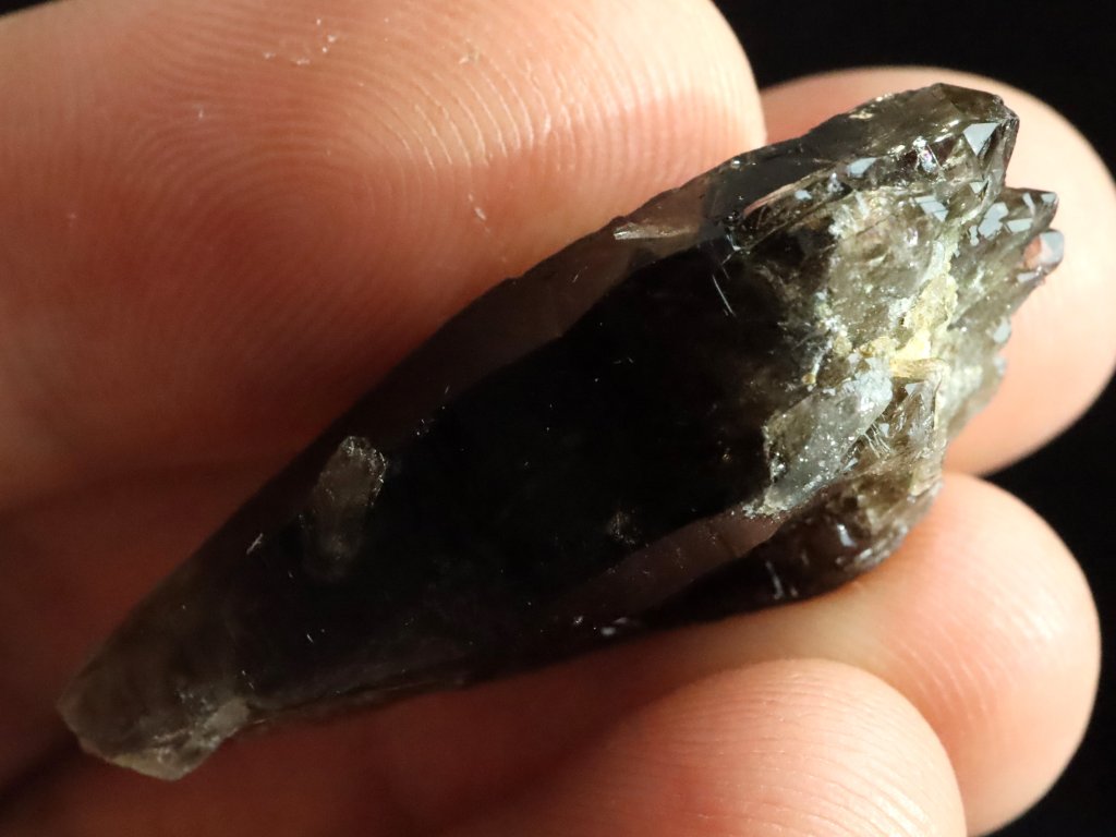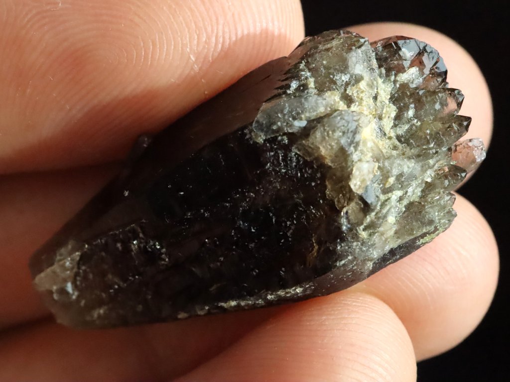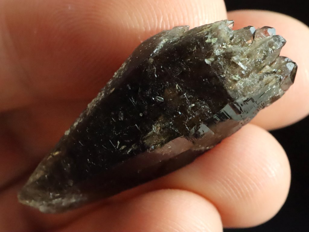 Jedná se o menší krystalek s délkou cca 3,5 centimetru, které mu se sice nezachovala / nevyvinula klasická špice, ale ze spodní strany je krásně tzv. dohojený množstvím drobounkých krystalků a špiček.