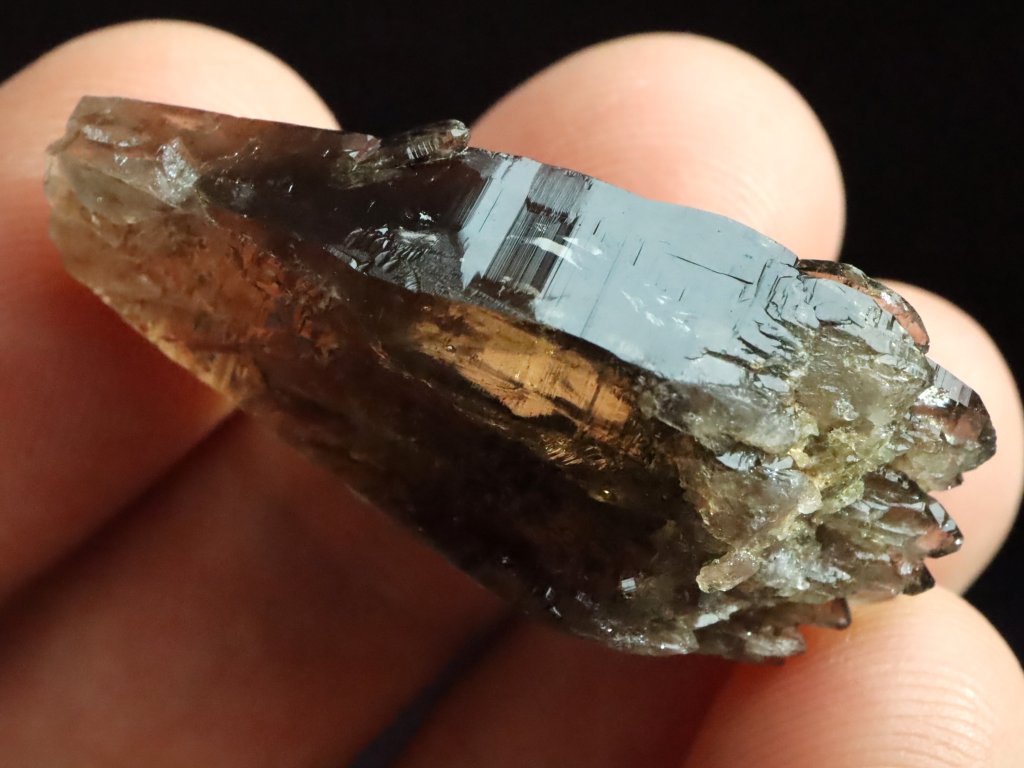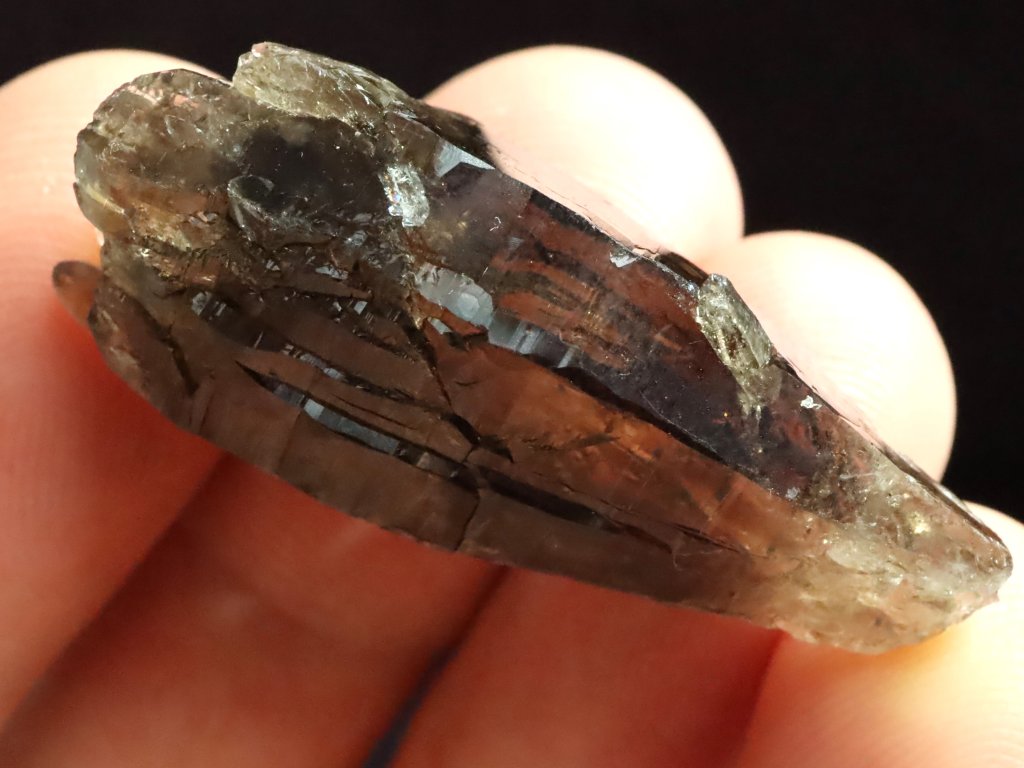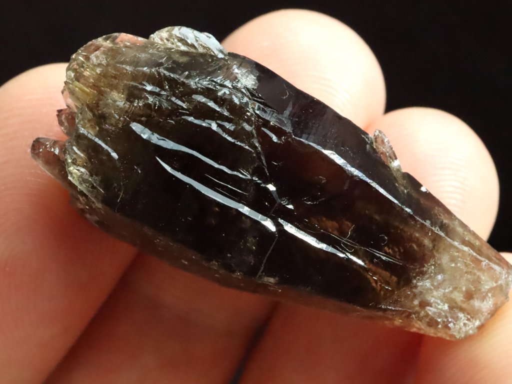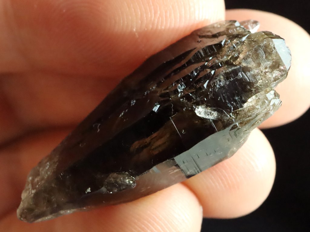 Jedná se o menší krystalek s délkou cca 3,5 centimetru, které mu se sice nezachovala / nevyvinula klasická špice, ale ze spodní strany je krásně tzv. dohojený množstvím drobounkých krystalků a špiček.