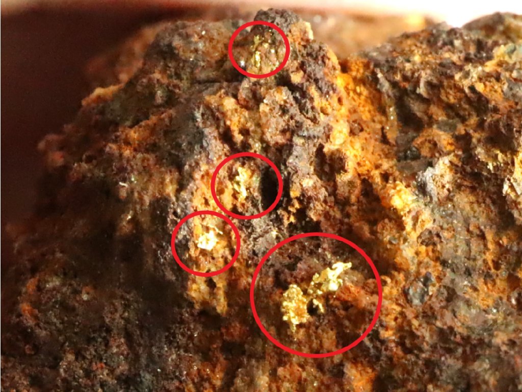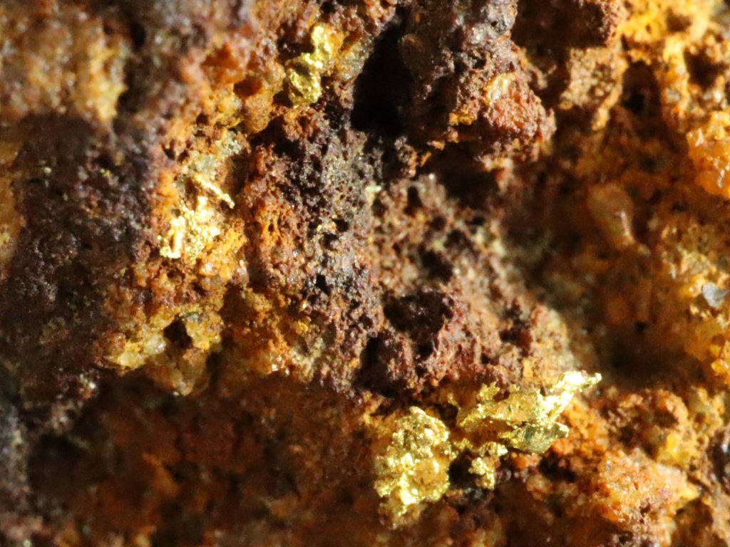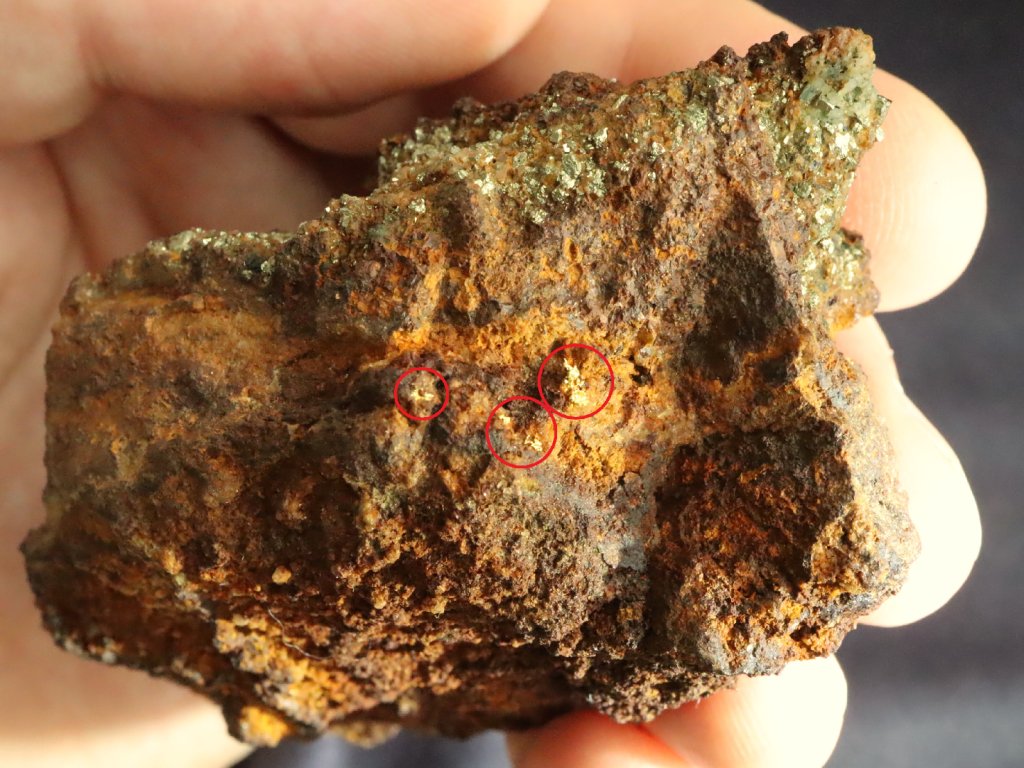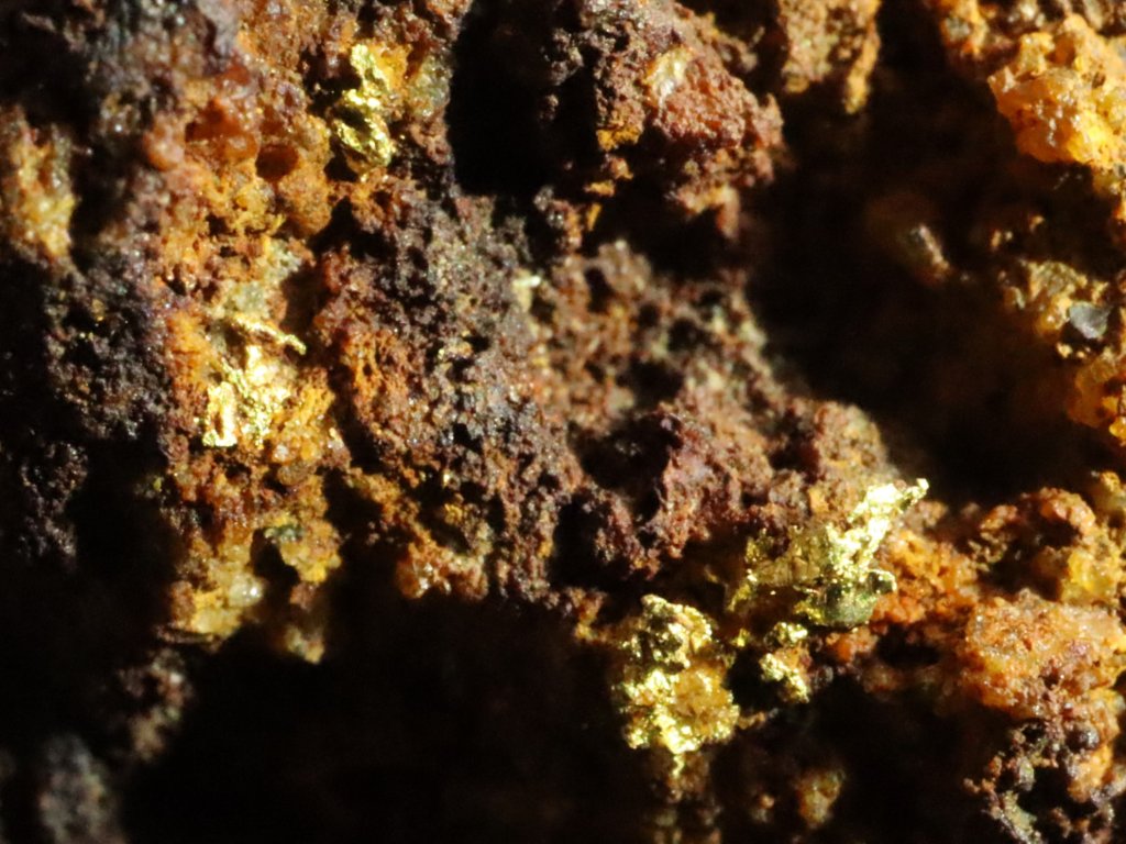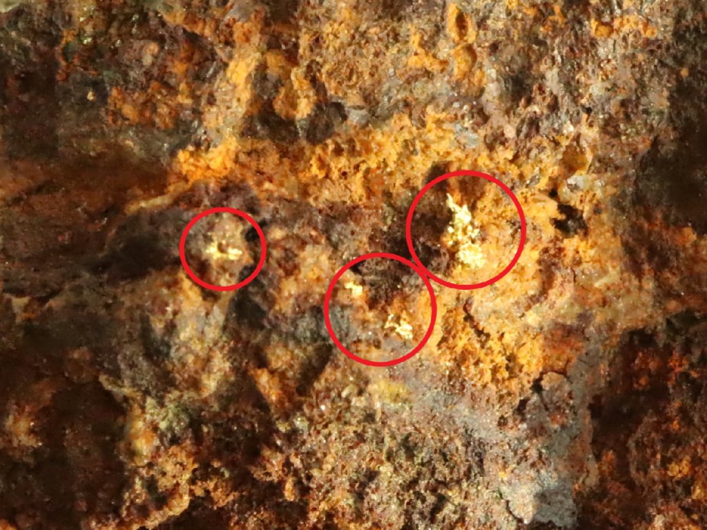Dominantní zlatinka / keříček se totiž pyšní velmi slušnými rozměry cca 3 x 1,5 milimetru. Vedle / nedaleko této hlavní zlatinky se pak nachází ještě několik dalších menších pěkných kousků přírozního ryzího zlata s rozměry okolo 0,5 mm.