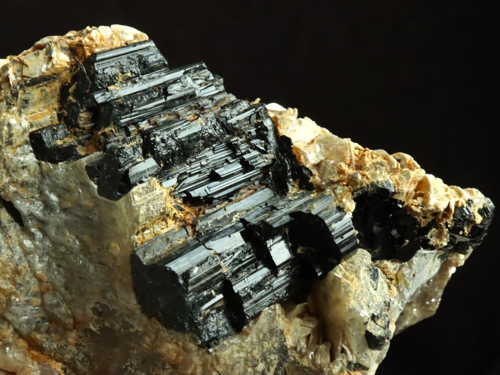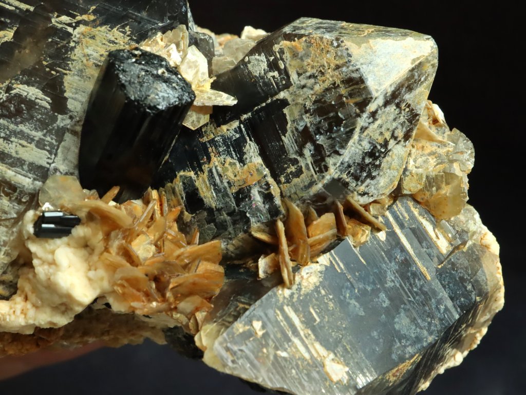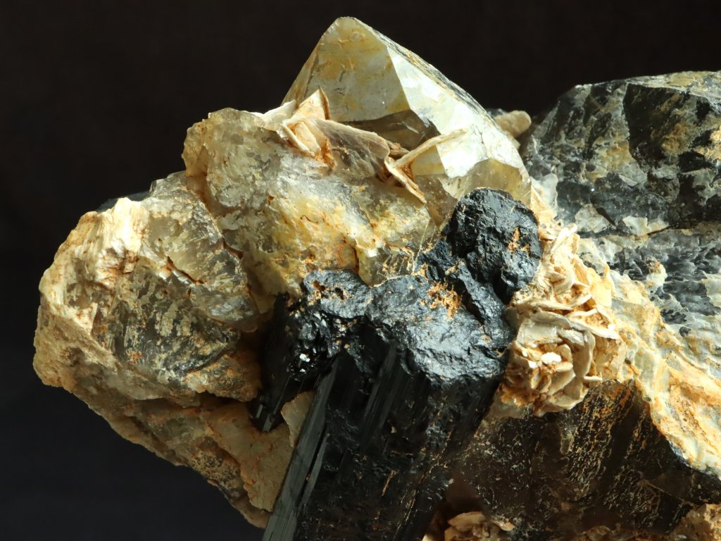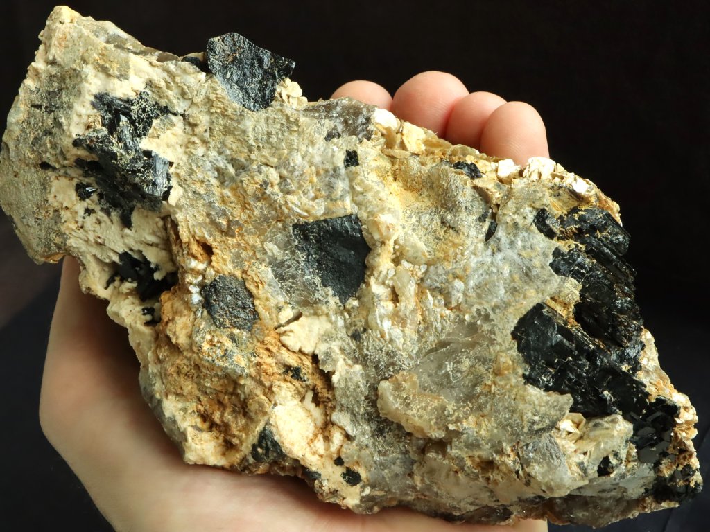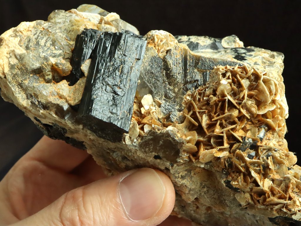 Několik dalších černých turmalínů je pak ještě zarostlých ze spodní podložkové strany v mateční hornině, kterou zde tvoří směs křemene, ortoklasu a albitu.