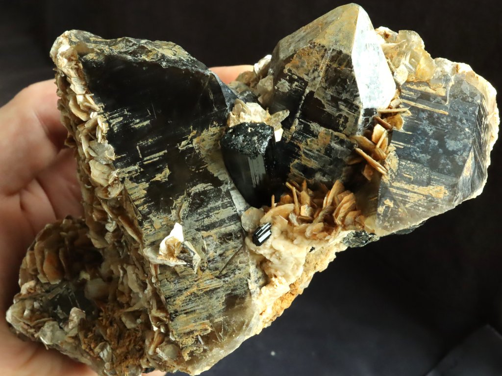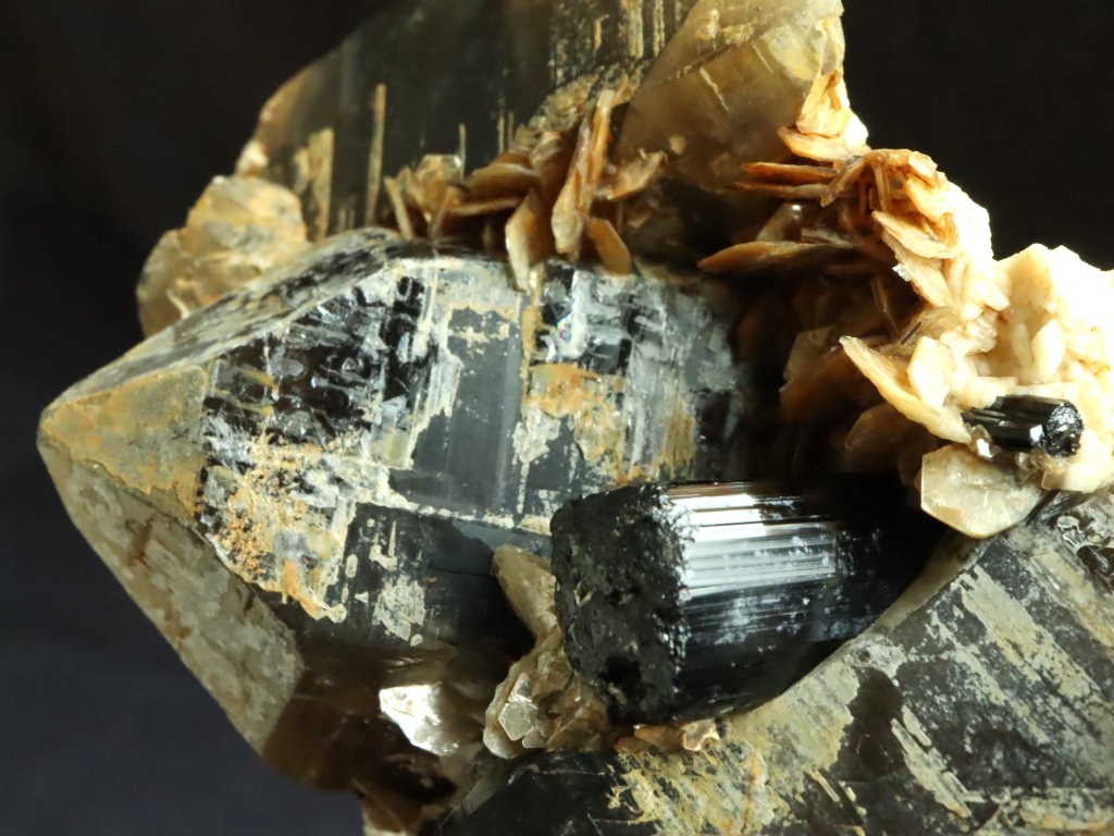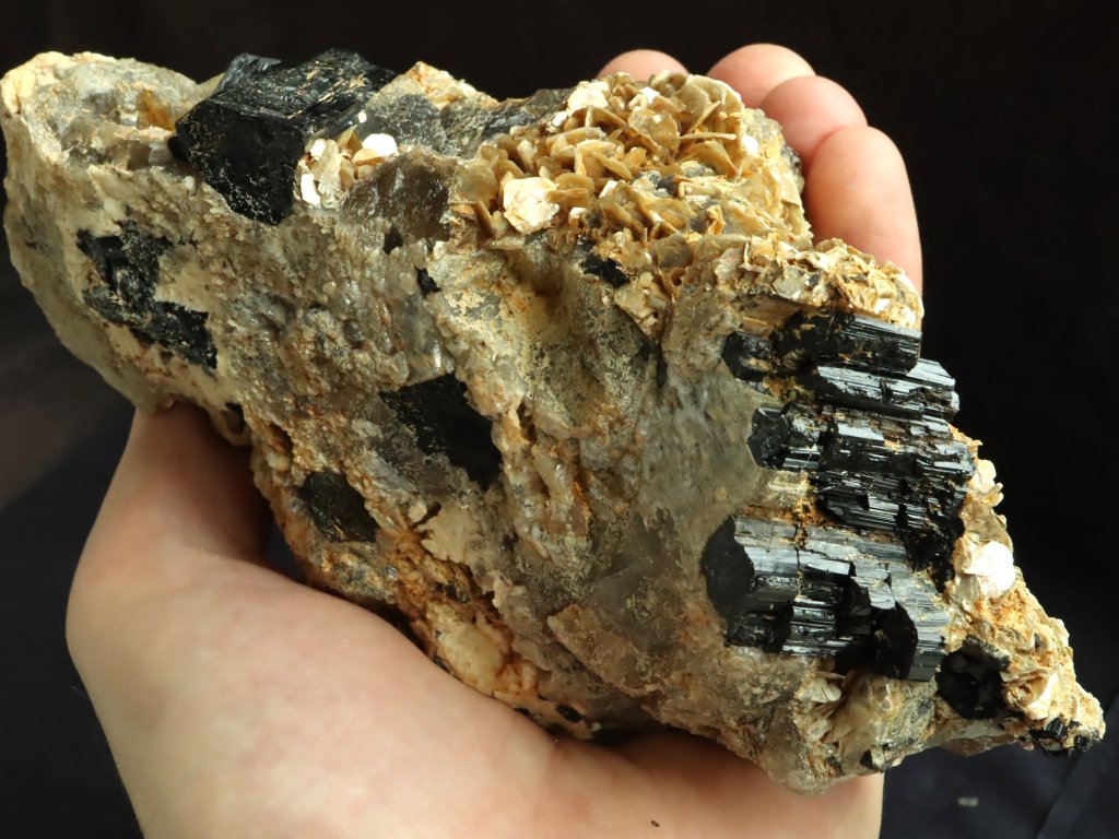 Na atraktivitě tomuto kousku však přidávají i zarostlé černé turmalíny skoryly, z nichž nejkrásnější se nachází z pohledové strany (špalík s délkou cca 15 milimetrů). Ze zadní strany však najdete i větší buclatý váleček s délkou 3,5 centimetru, nebo zajímavý částečně stuňovitý skoryl.