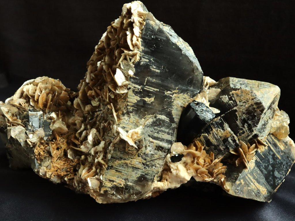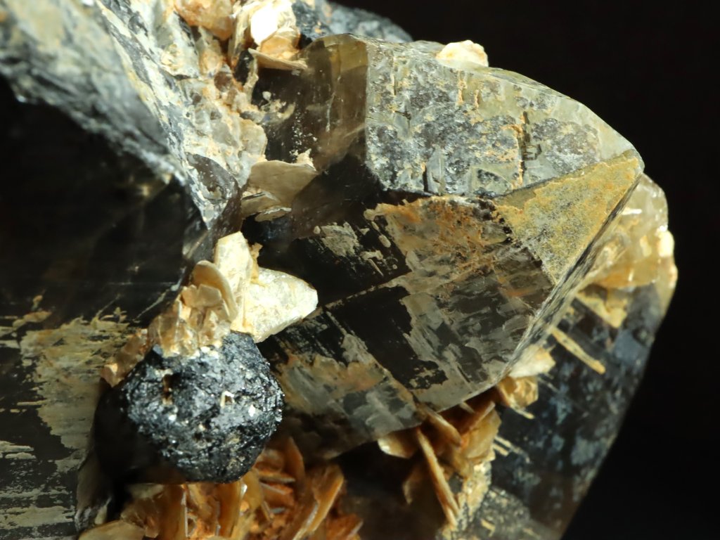 Moriony mají typický (kvalitní) černý odstín, místy s nepatrným povlakem limonitu. Značná část vzorku (přibližně polovina) je pak fantasticky pokryta bohatou výzdobou lupenitých krystalků muskovitu (světlou stříbrnou slídou). Ukázka muskovitu je tu vskutku jedinečná / vyjímečná a mimořádně kvalitní / estetická.