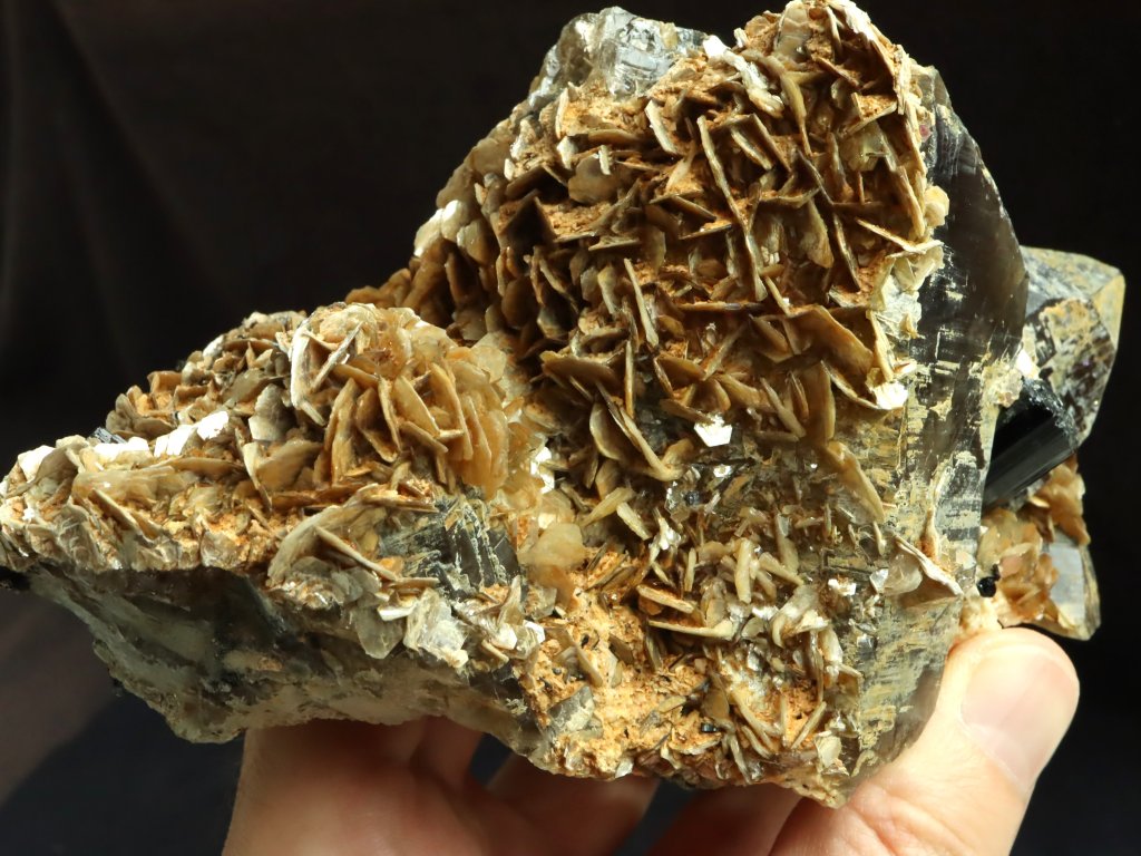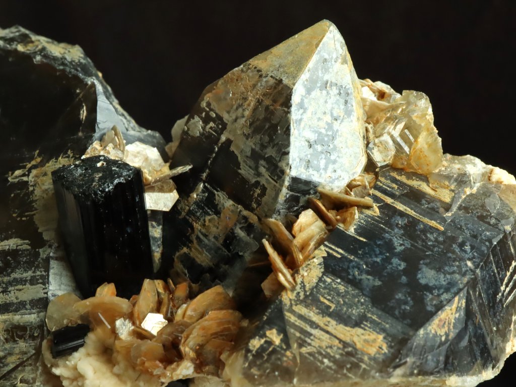 Unikátní vzorek morionu v atraktivní a vzácné kombinaci s černými turmalíny skoryly a muskovitem.