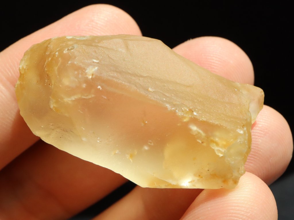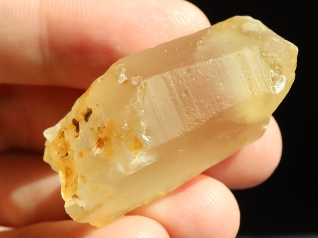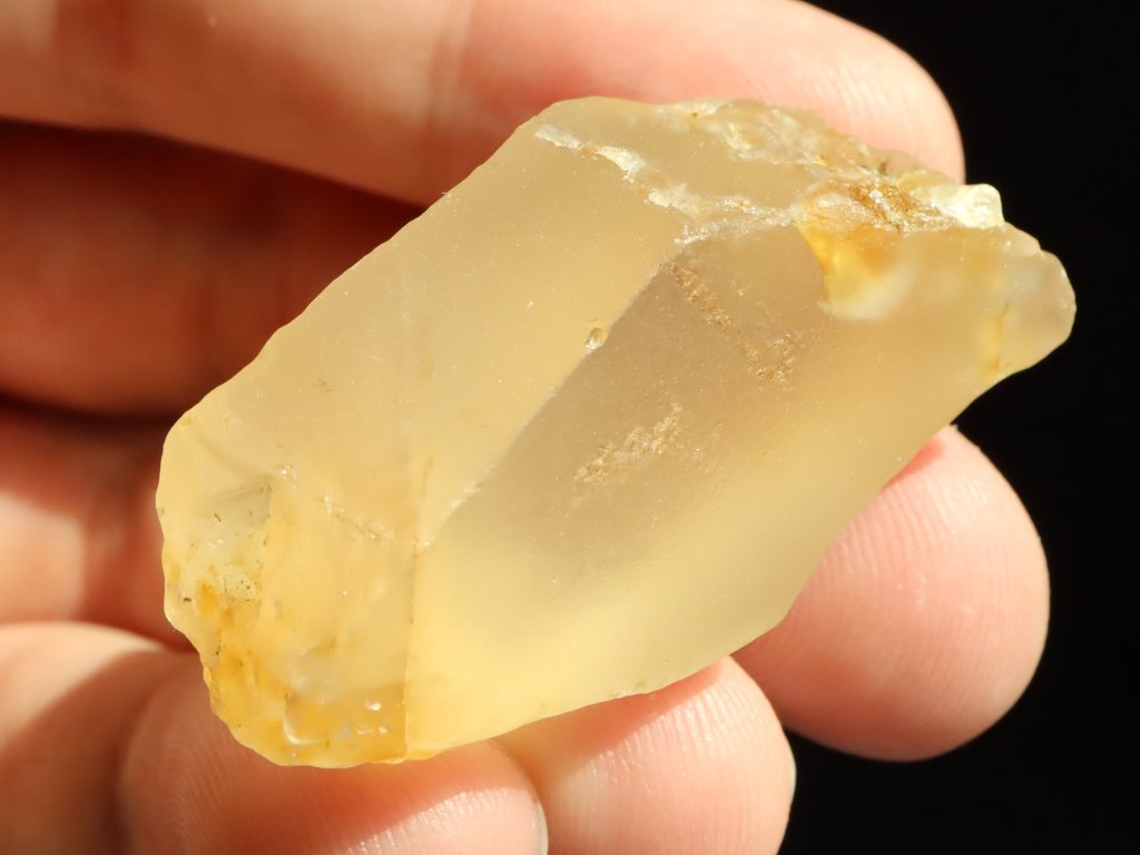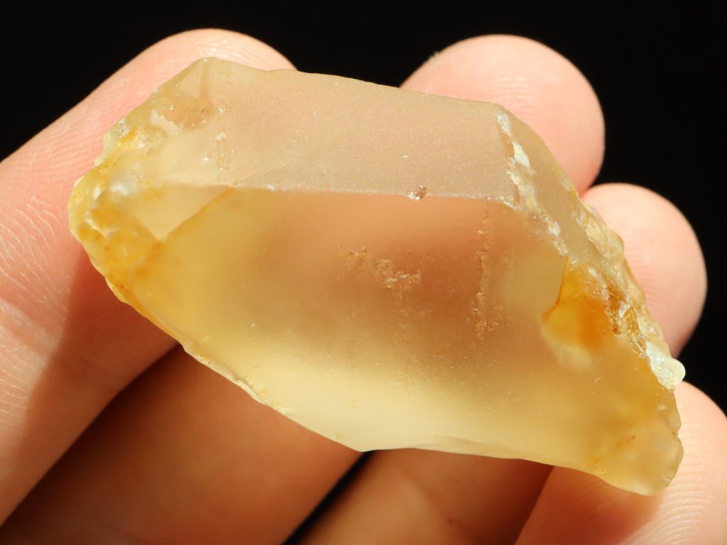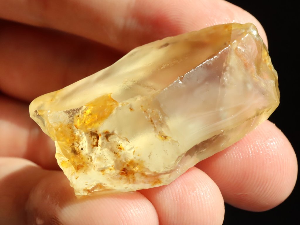 Sluníčkem či baterkou je citrín celý skvěle průsvitný, matný povrch však nedovoluje nahlédnout do vnitřního světa kamínku. I přes to je však celkem dobře patrné, že tento fragment ukrývá vysokou místy až tzv. drahokamovou čistotu s pouze menším množstvím peříček a mlhovinek.