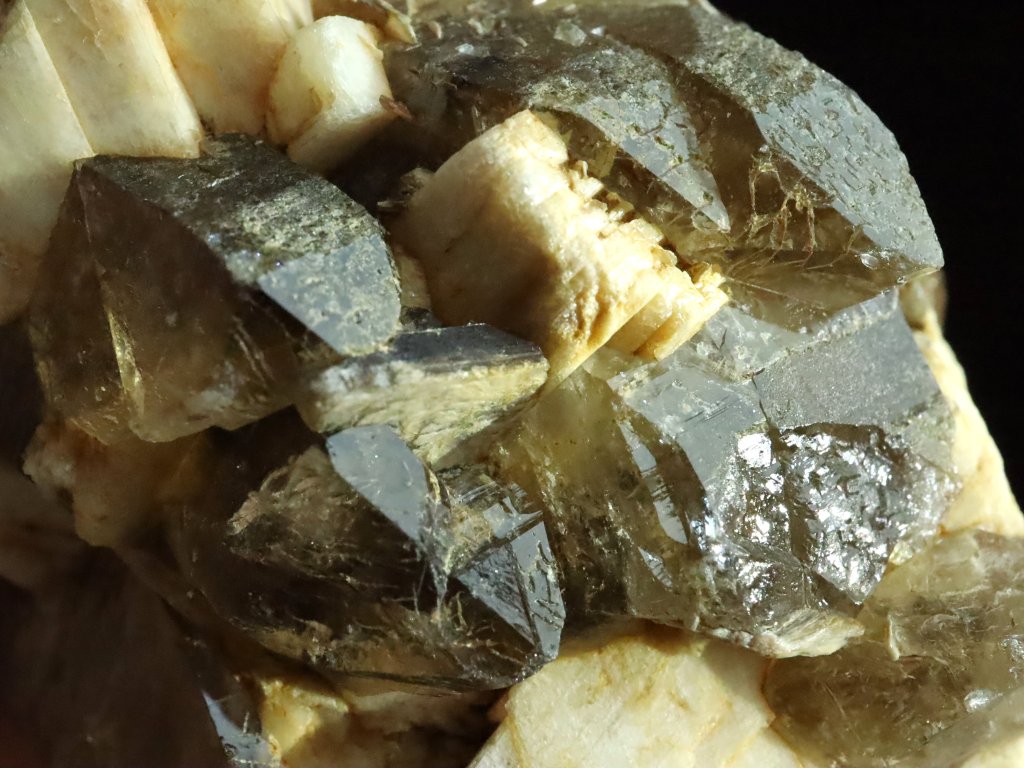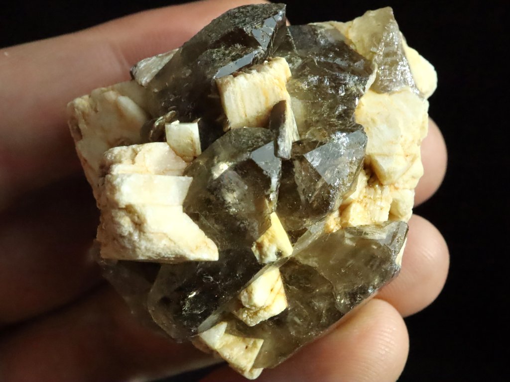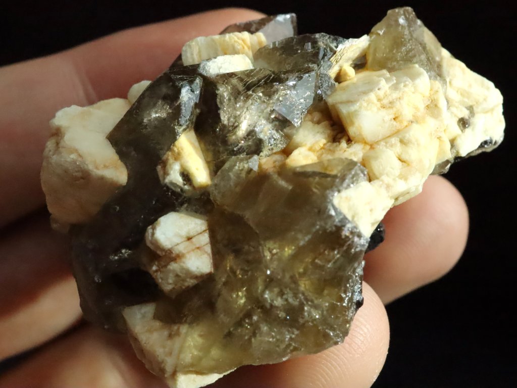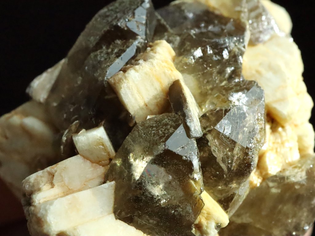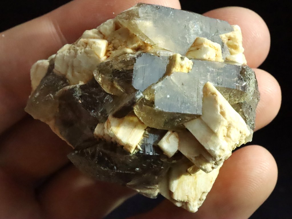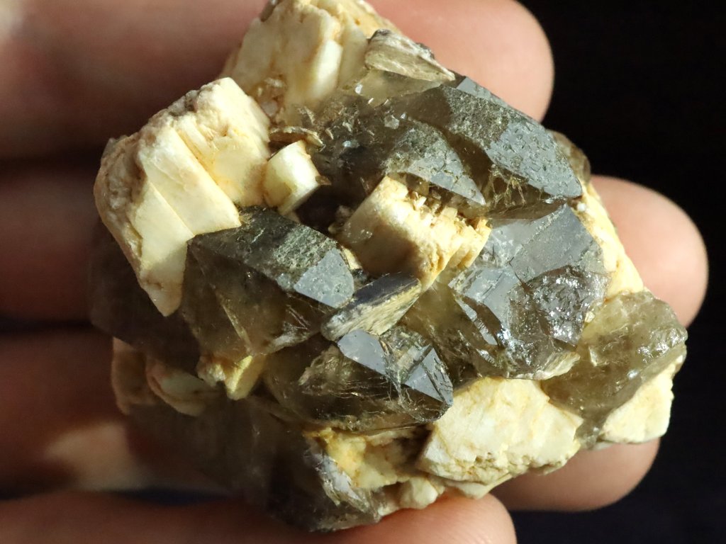 Mezi těmito kostičkami pak najdete zarostlé krystalky hnědých až kouřových záhněd. Nachází se zde přibližně šest krystalků, které jsou solidně zachovalé.