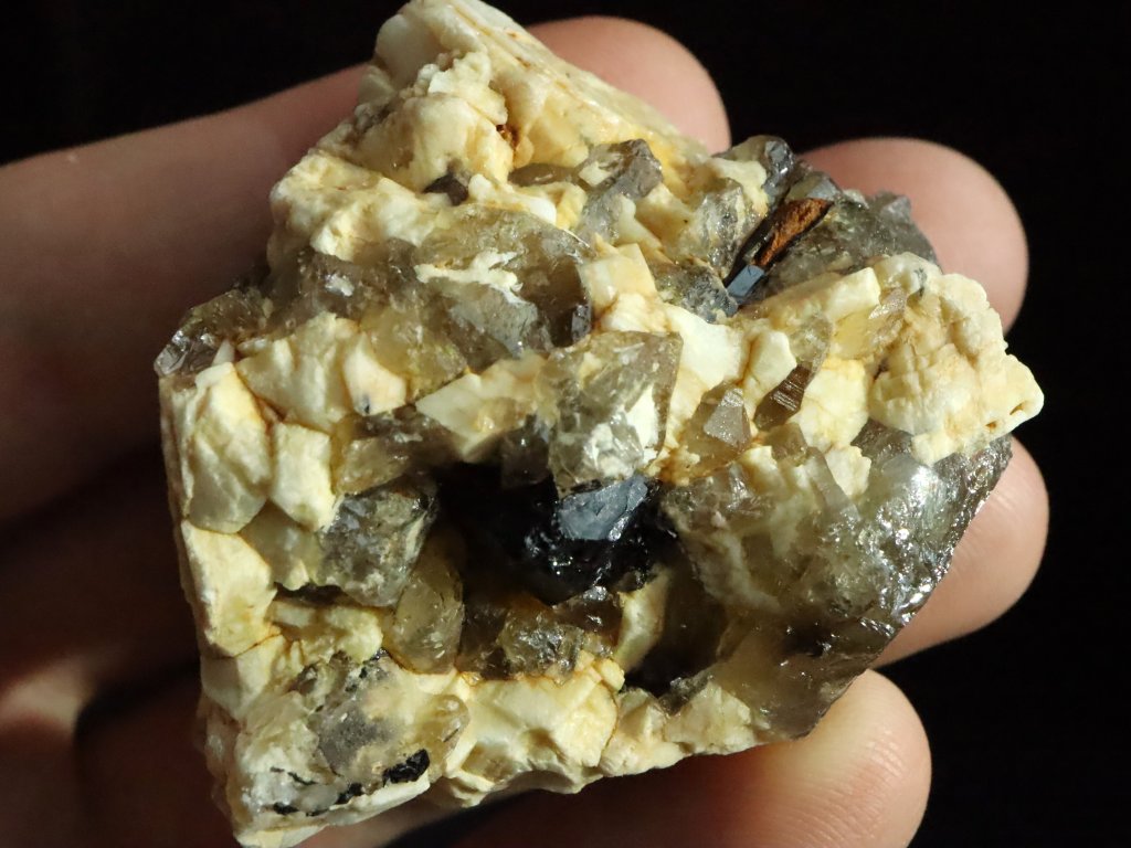 Kostičky albitu se zarostlými krystalky záhněd a černým turmalínem