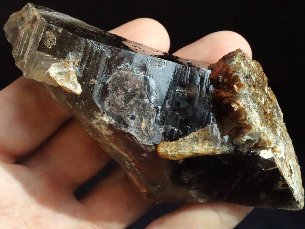Krásný fragment krystalu morionu s vnitřním světem a muskovitem