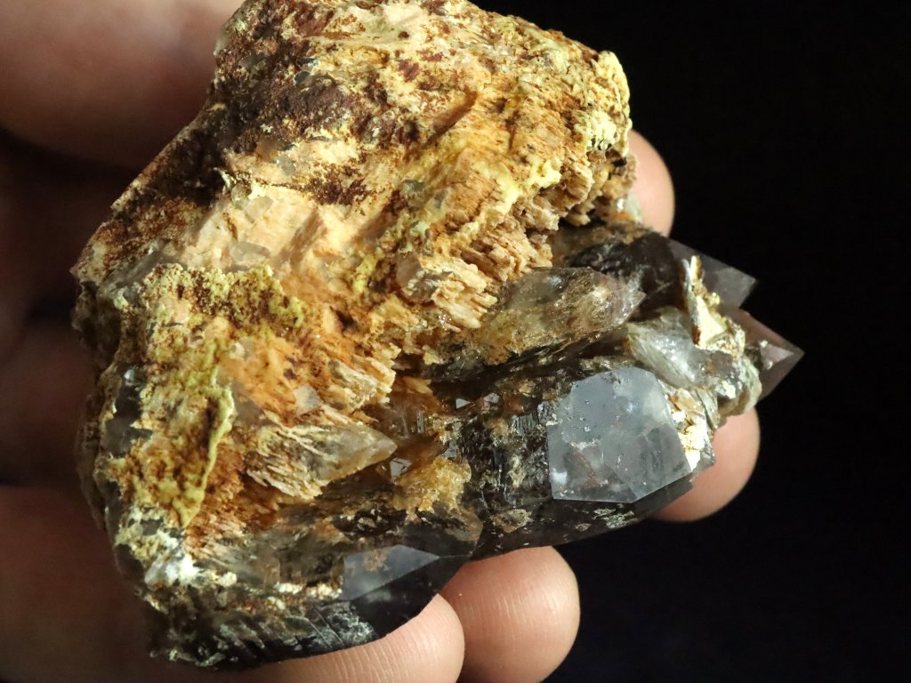 Podložku neboli mateční horninu zde tvoří ortoklas, který místy decentně pokrývá povlak oranžového limonitu.