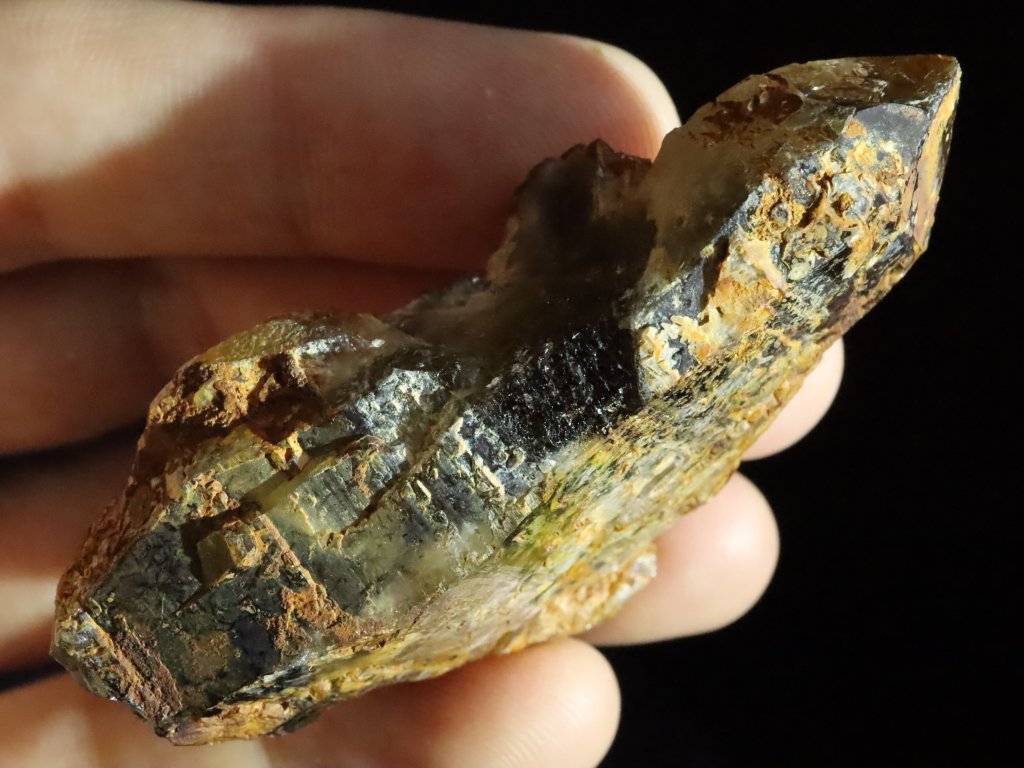 Podlouhlý krystal temné až černé záhnědy tzv. morionu pocházející z naleziště Bohdalec (Vysočina).
