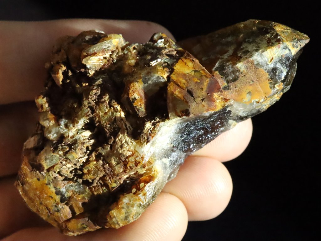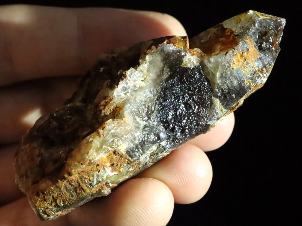 Celý vzorek je pak hezky pokrytý povlakem hnědo-oranžového limonitu, který morionu dodává originální přírodní patinu. Spatřit tu však můžete i lupínky muskovitu (stříbrné slídy).
