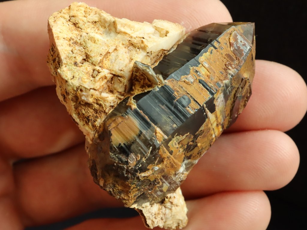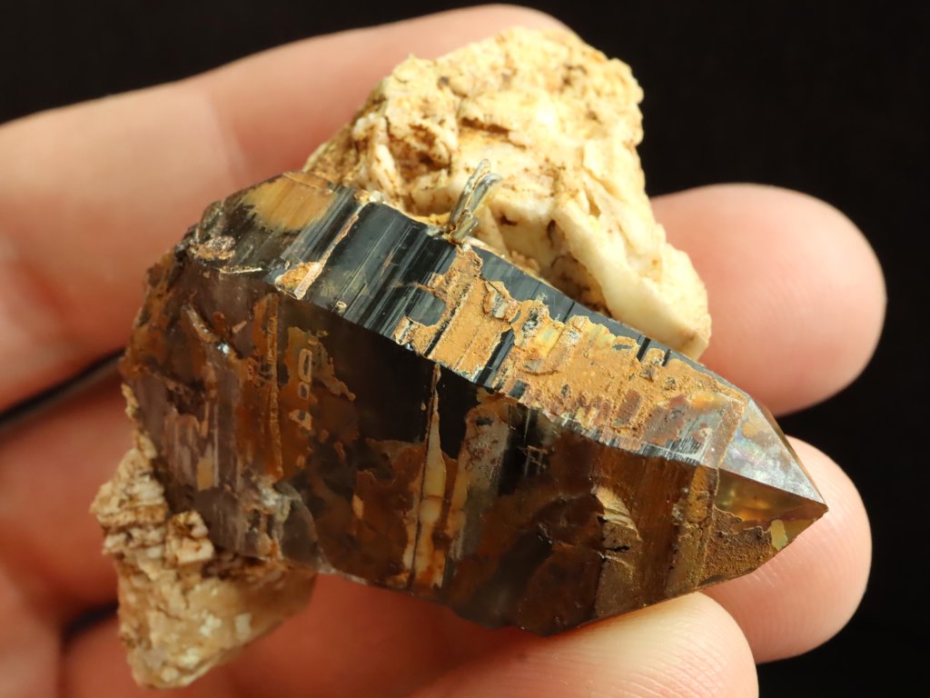 Jedná se o perfektně zachovalý krystal morionu s délkou 4,5 centimetru, který je esteticky narosltý na podložce / mateční hornině tvořené směsí albitu a živce. Spatřit tu však můžete i pěkný lupínek muskovitu neboli stříbrné slídy.