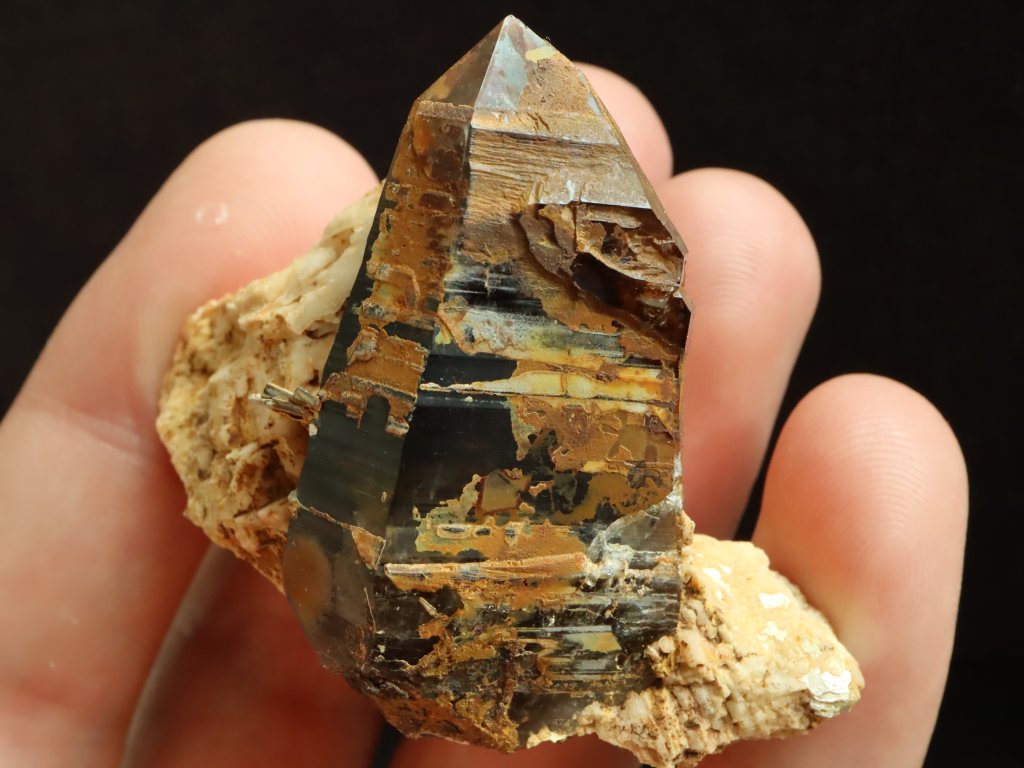 Krystal morionu s povlakem limonitu narostlý na mateční hornině