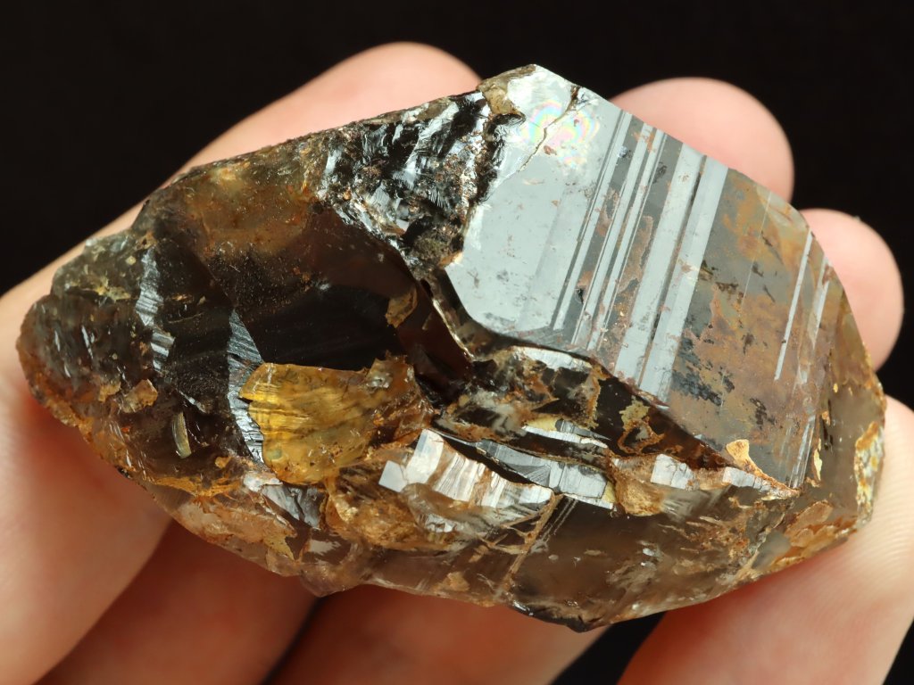 Morion má velmi temně hnědý až černý odstín, místy s kouřovými pasážemi. Sluníčkem či baterkou je pak krystal místy i hezky průsvitný.