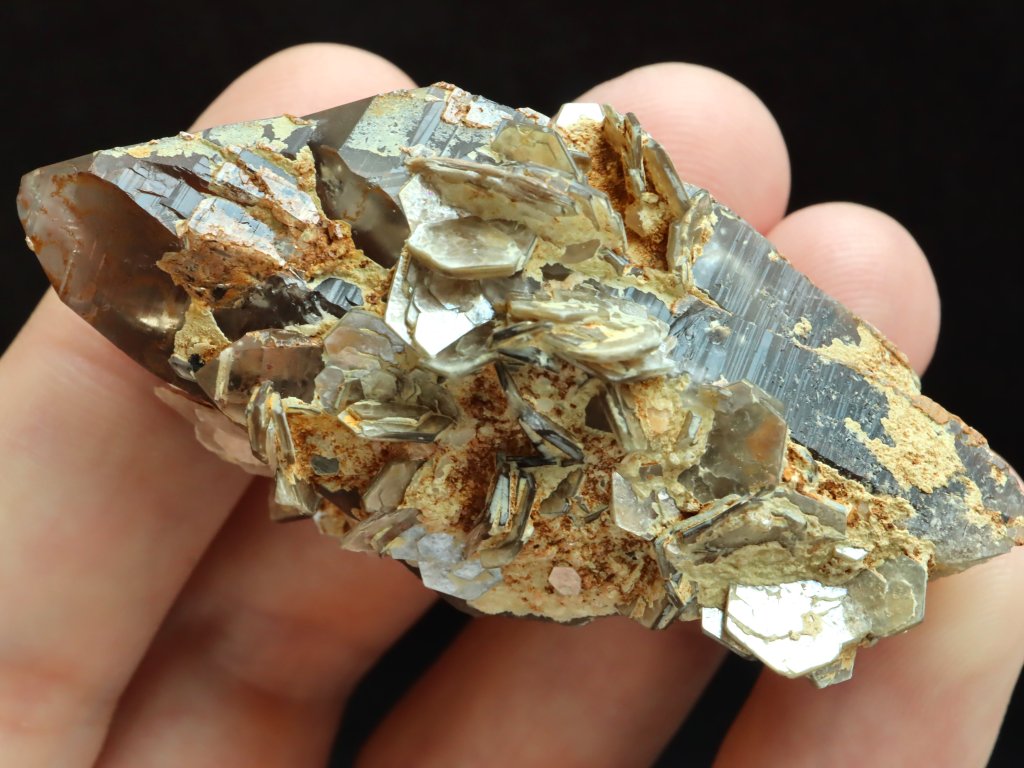 Jedná se o solidně zachovalý krystal morionu s délkou 6 centimetrů, který je opravdu nádherně zdobený množstvím lupenitých krystalků muskovitu, neboli lidově řečeno stříbrné slídy.