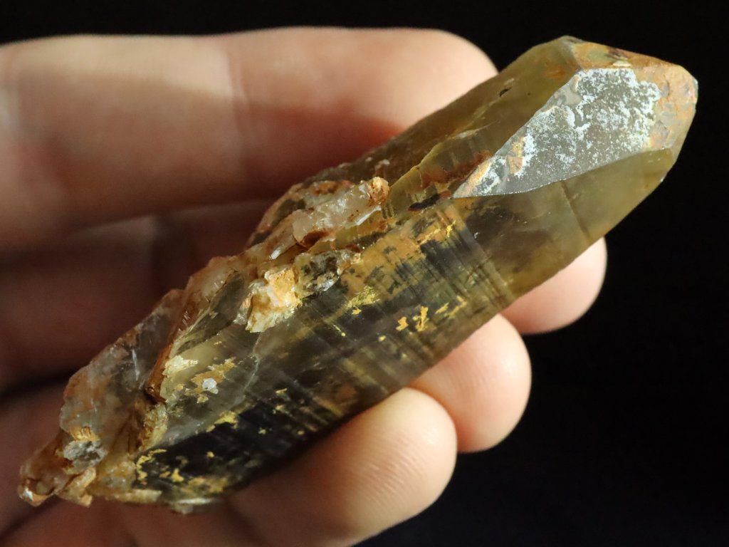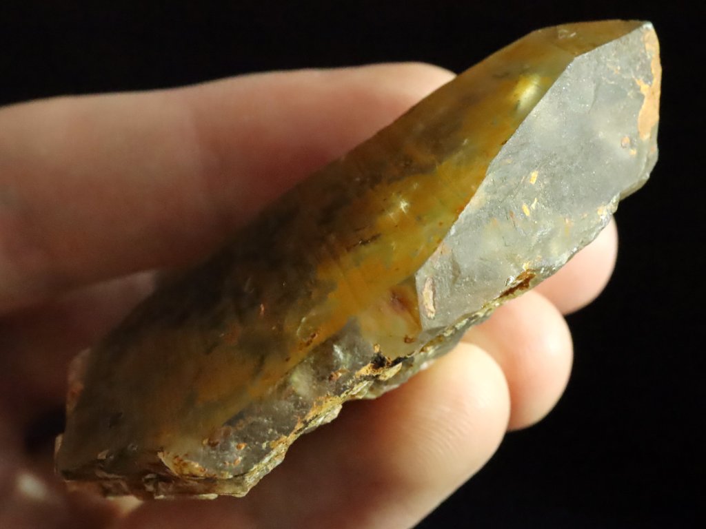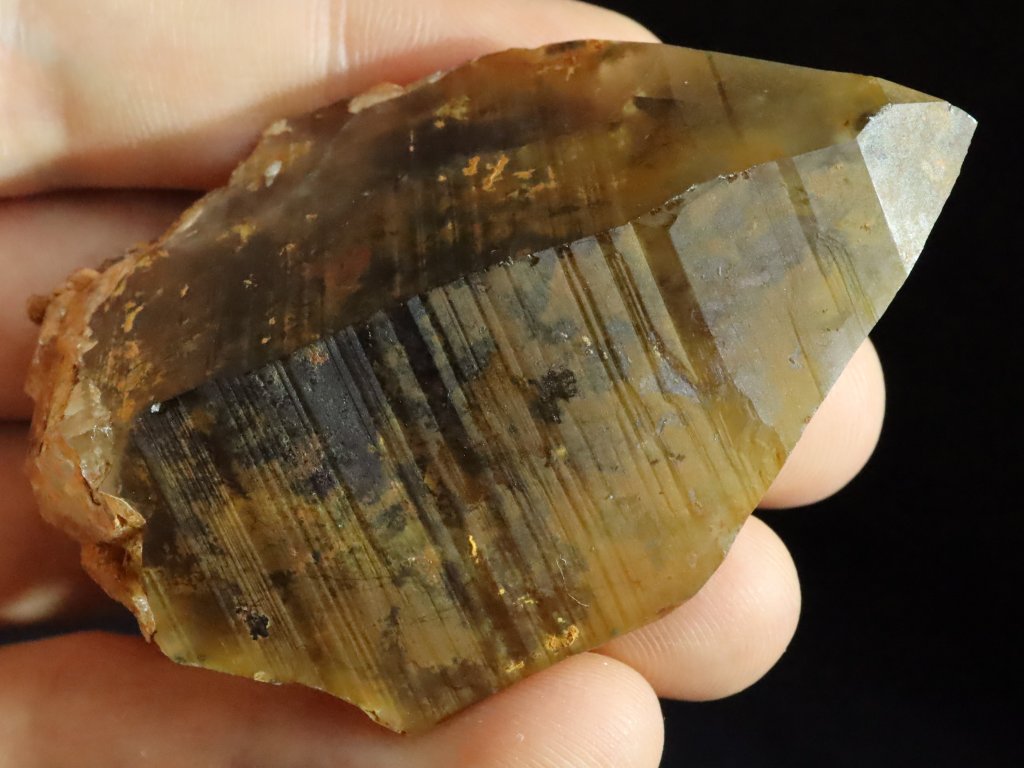 Celý krystal má pak výraznějí povlak hnědo-oranžového limonitu. Díky tomu má však záhněda hezkou přírodní patinu.