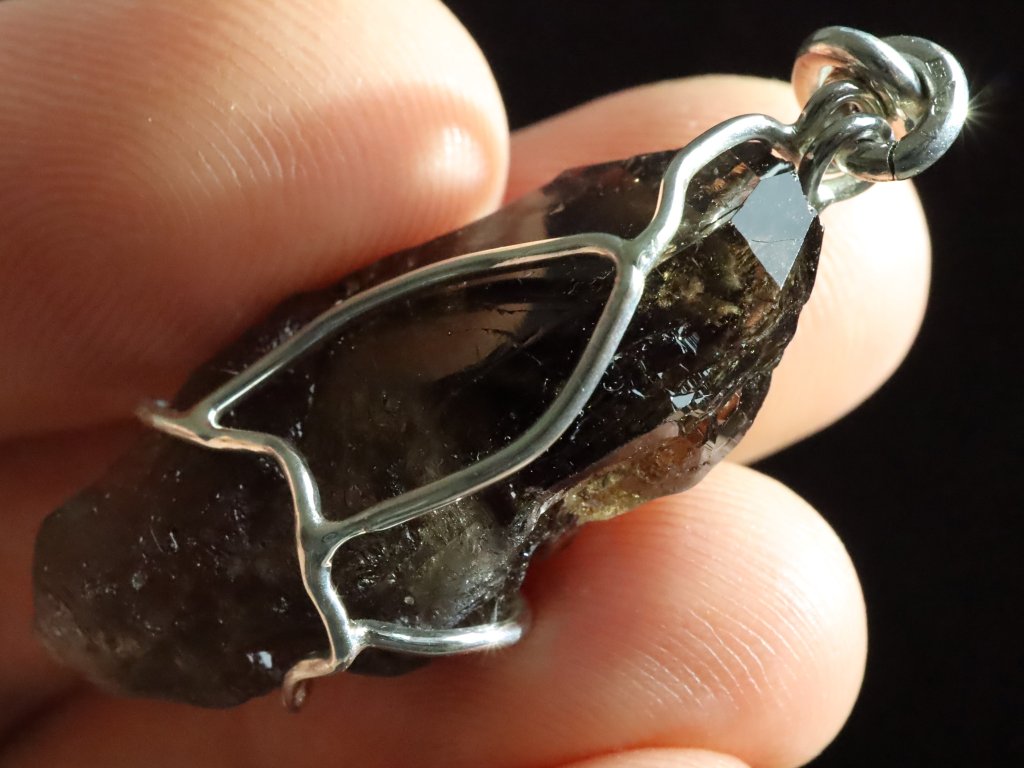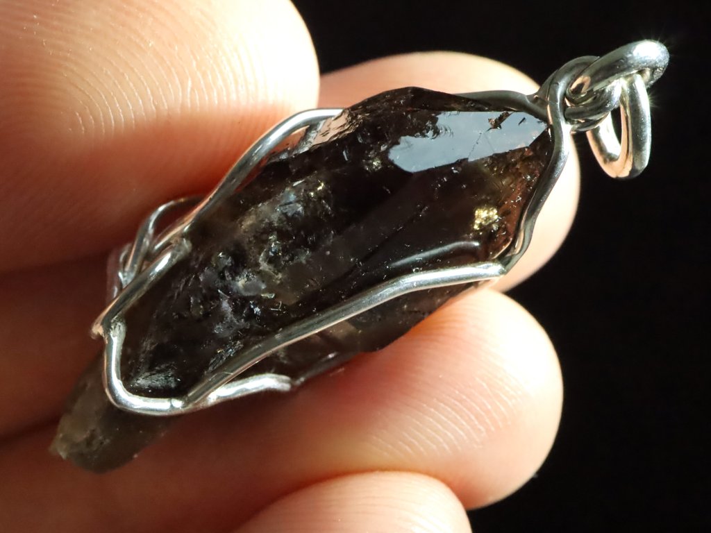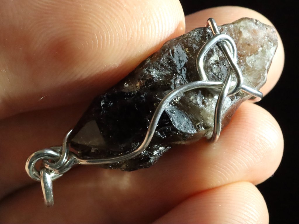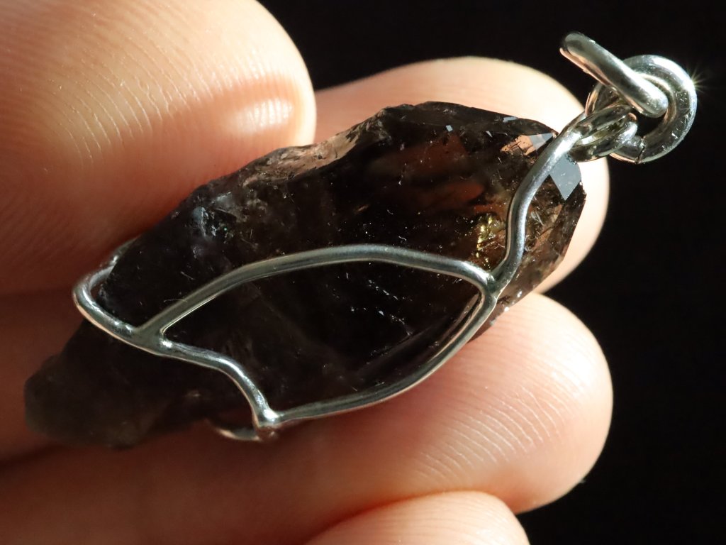 V tomto originálním přívěsku se můžete kochat krystalkem vzácného morionu, který zaujme především svojí krásně zachovalou špičkou s netradičním částečně stupňovitým růstem.