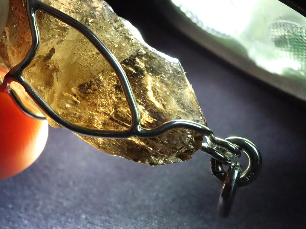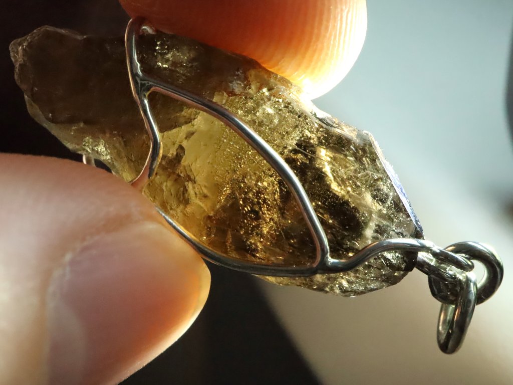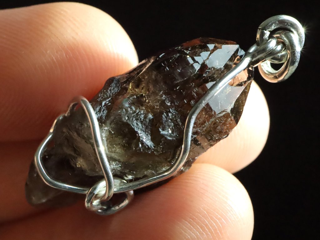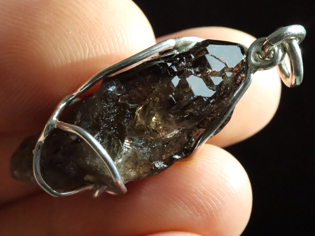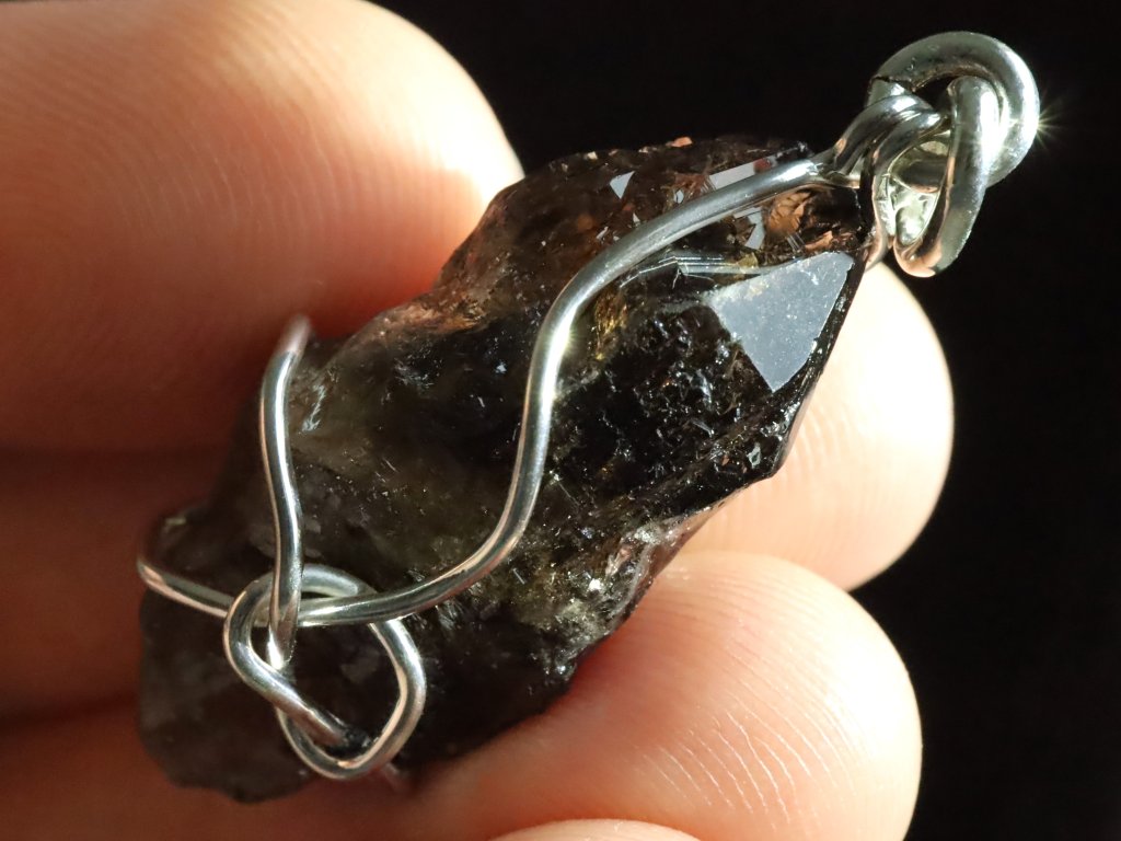 V tomto originálním přívěsku se můžete kochat krystalkem vzácného morionu, který zaujme především svojí krásně zachovalou špičkou s netradičním částečně stupňovitým růstem.