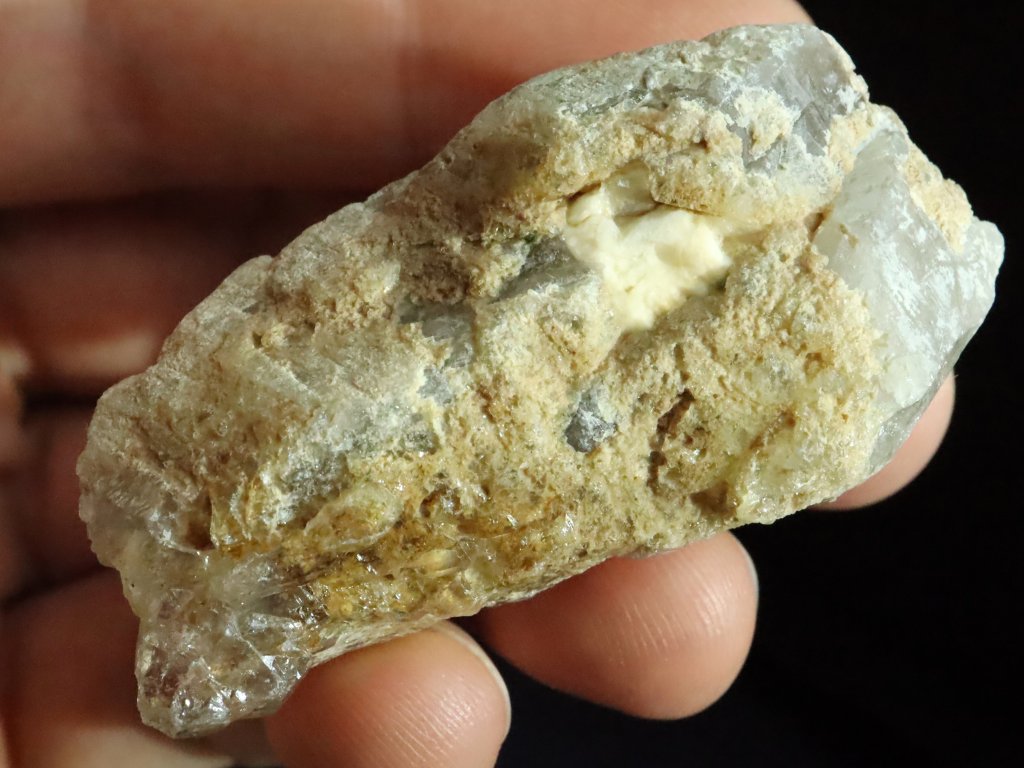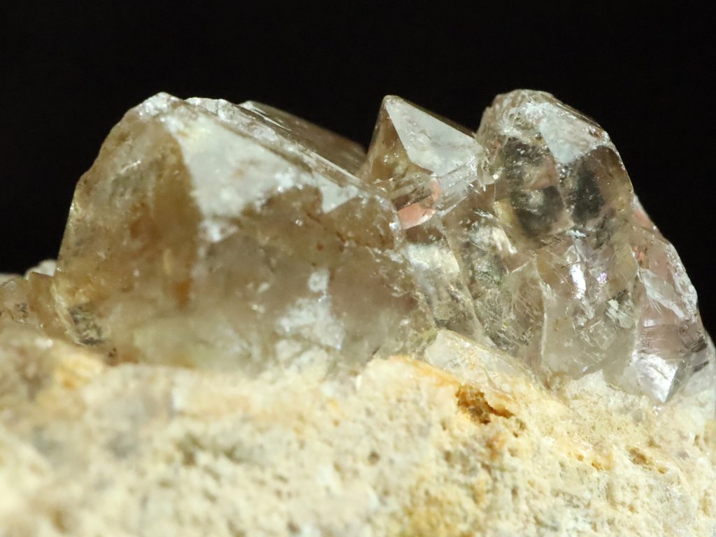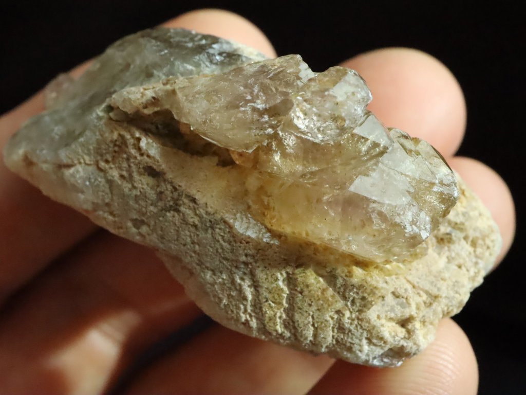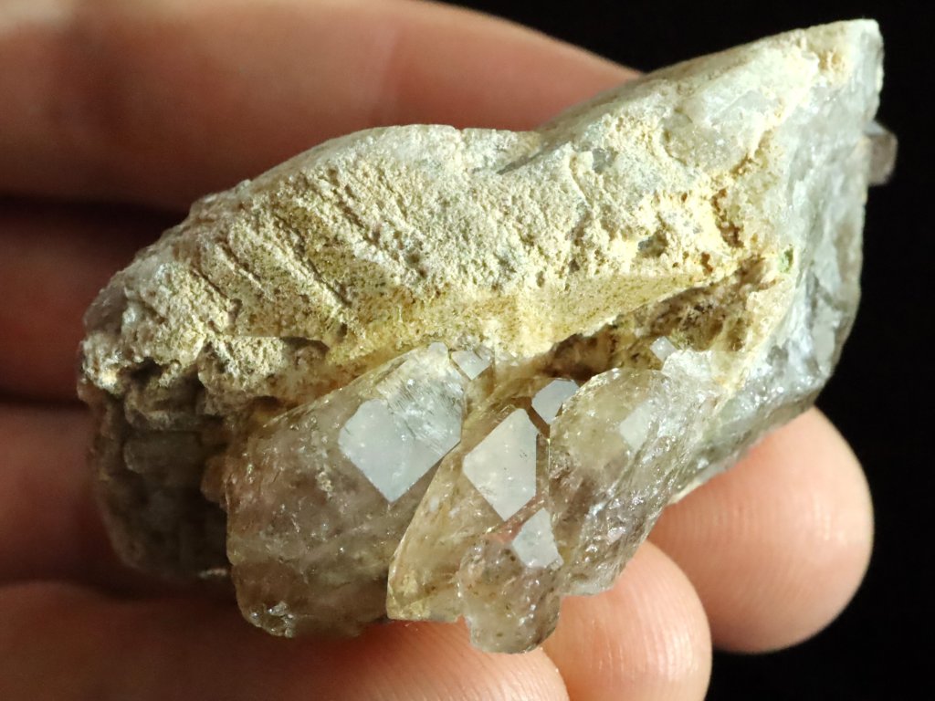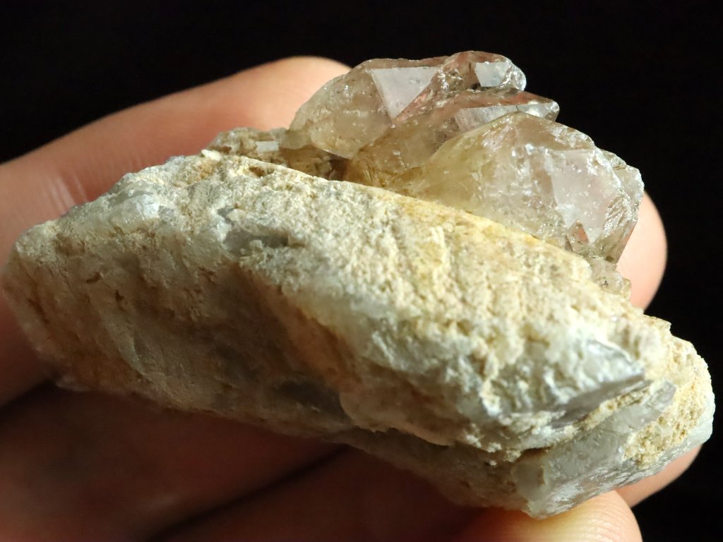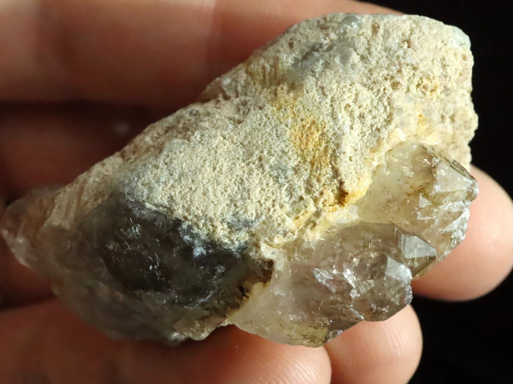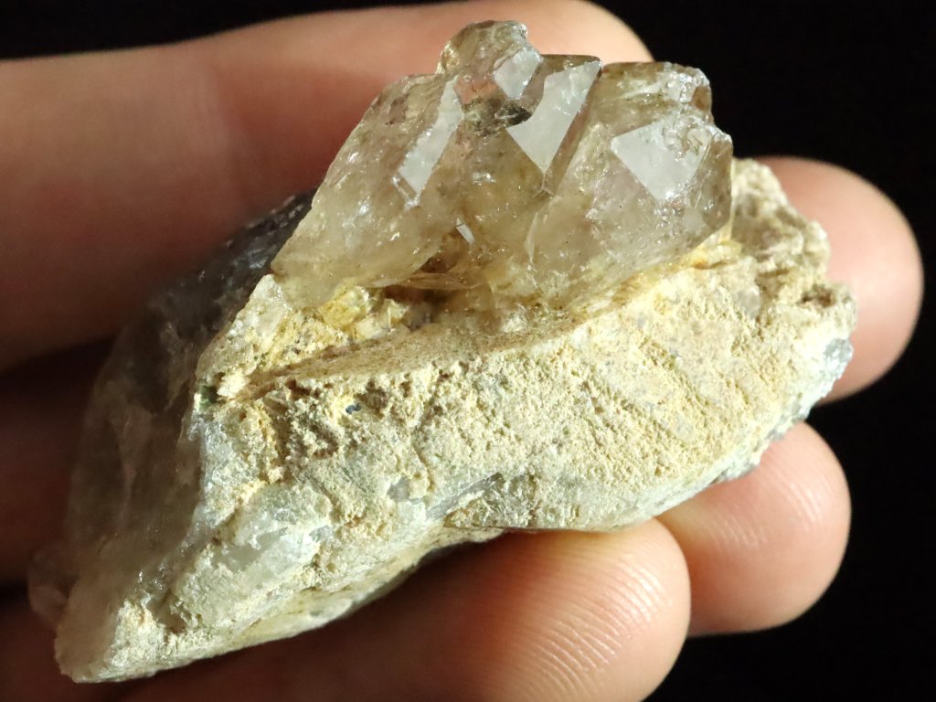Jedná se o několik krystalků a špiček kouřové záhnědy, která je narostlá na podložce / mateční hornině tvořené směsí křemene, albitu a ortoklasu.