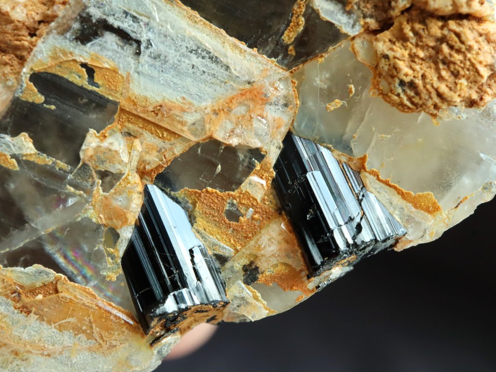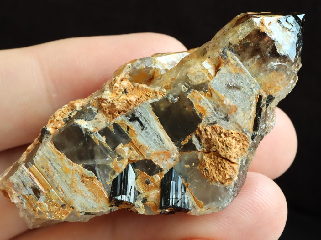 Asi nejzajímavější je však na tého záhnědě dvojice malých zarostlých špalíčků černých turmalínů - viz foto. Ze zadní strany krystalu se pak nachází ještě jeden větší avšak ne příliš zachovalý vzorek černého turmalínu.
