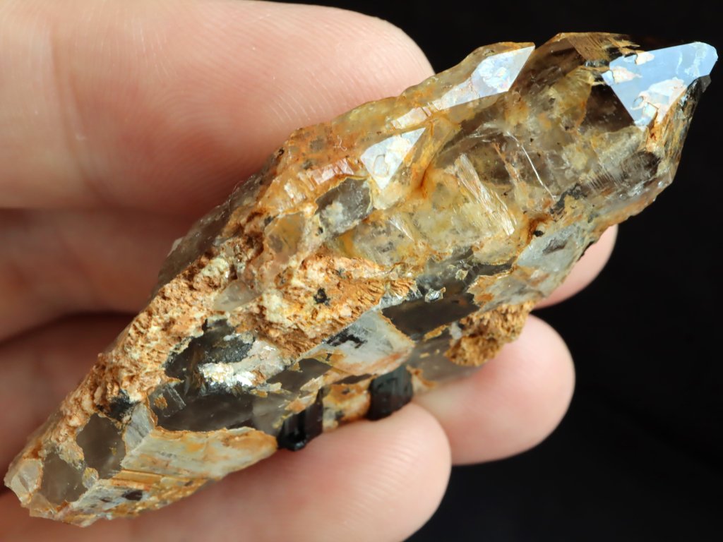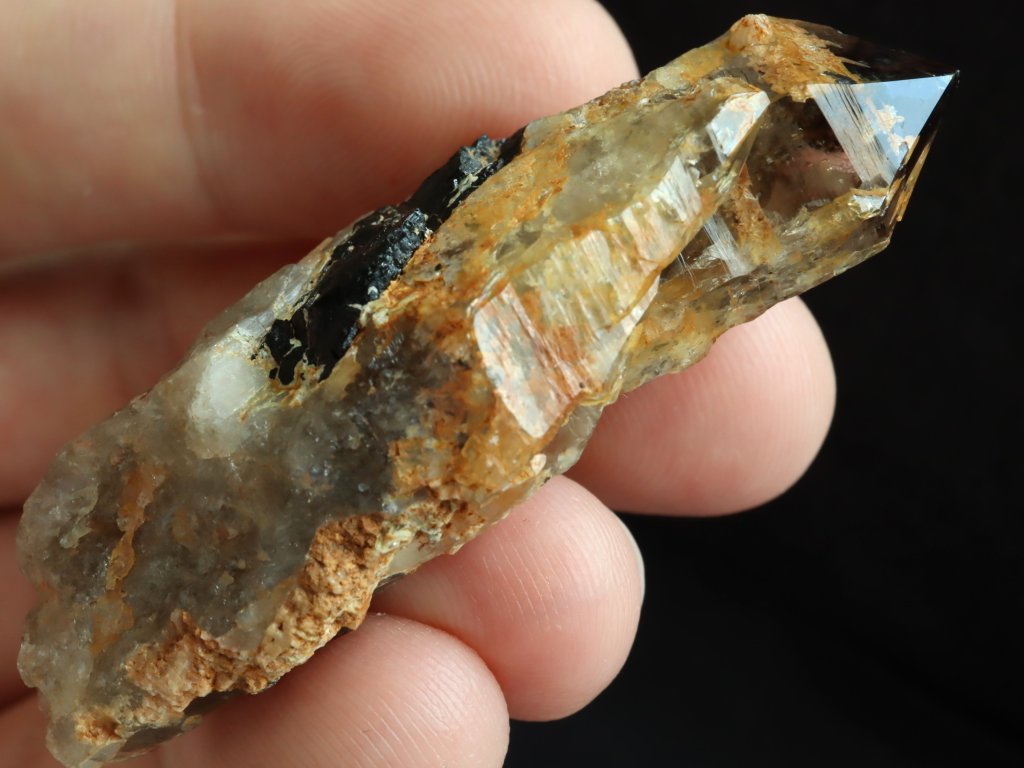 Krystalek záhnědy se zarostlými drobnými černými turmalíny