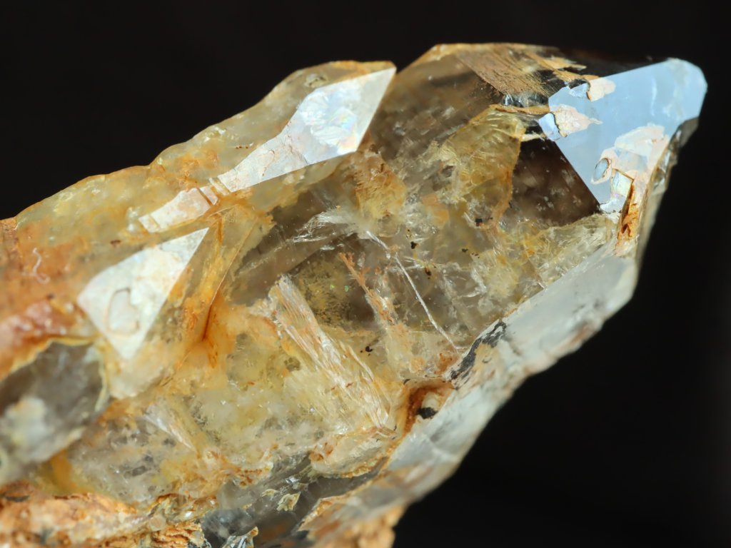 Záhněda má kouřový odstín, do značné míry je však pokryta povlakem oranžového limonitu (oxidem železa), či lehce protkána mléčným křemenem. Ve spodní části pak krystal postupně přechází do podložkové neboli mateční horniny, kterou zde tvoří šedý křemen. Místy jsou na vzorku i stopy ortoklasu.