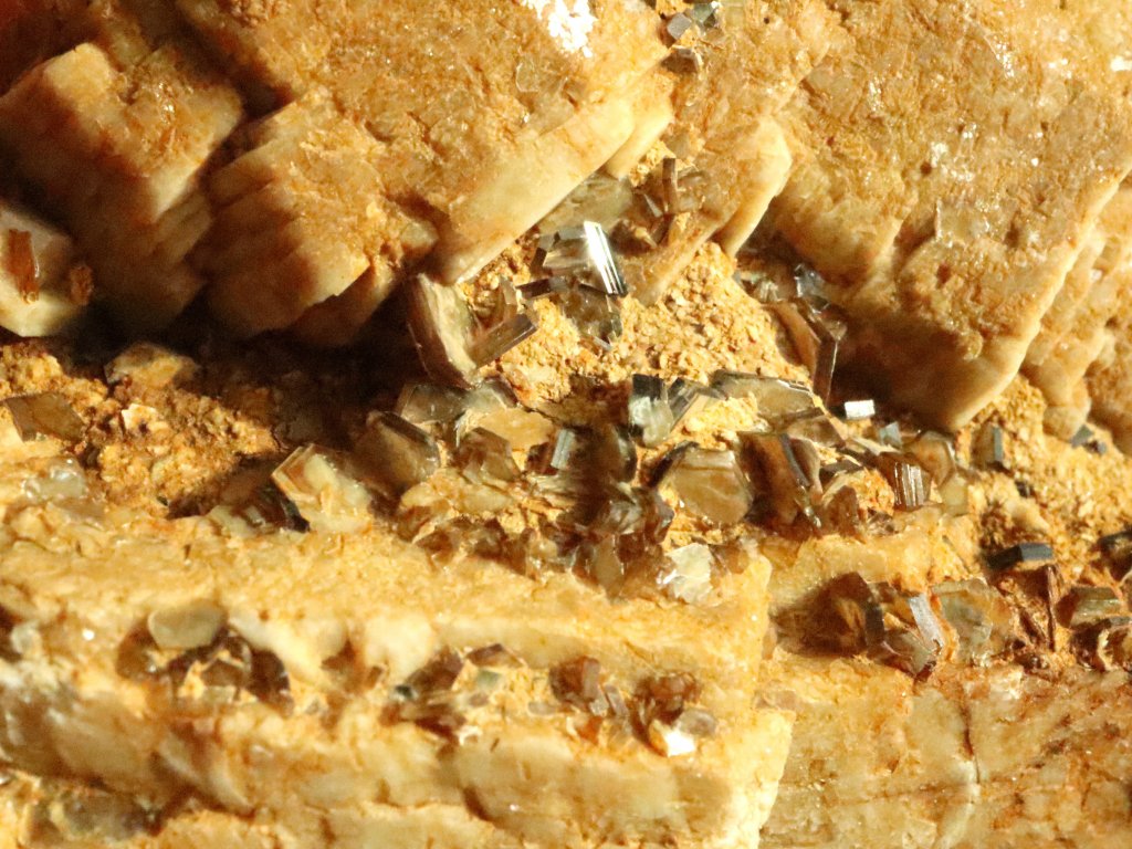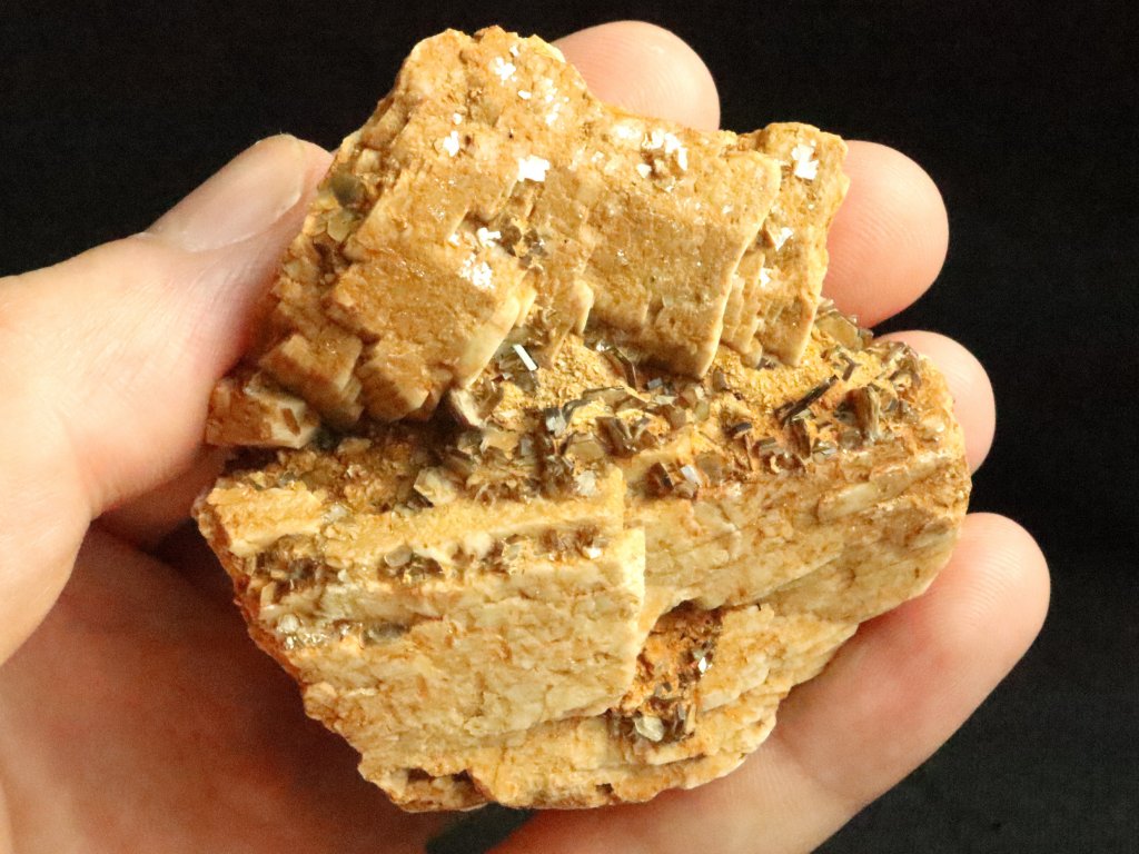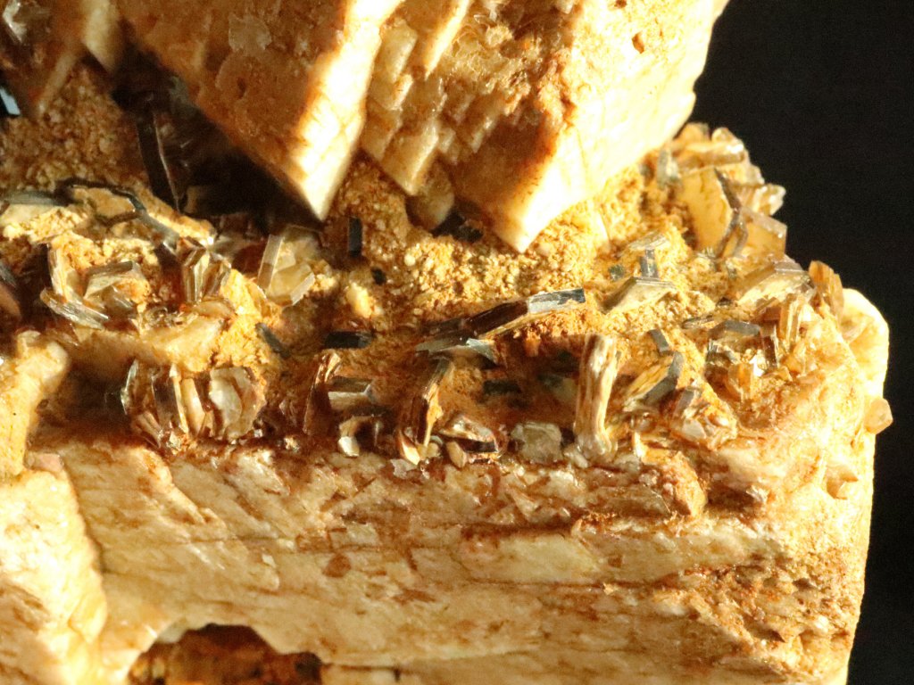 Vzorek je však také hojně zdobený lupínky a destičkami muskovitu (světlé stříbrně lesklé slídy).