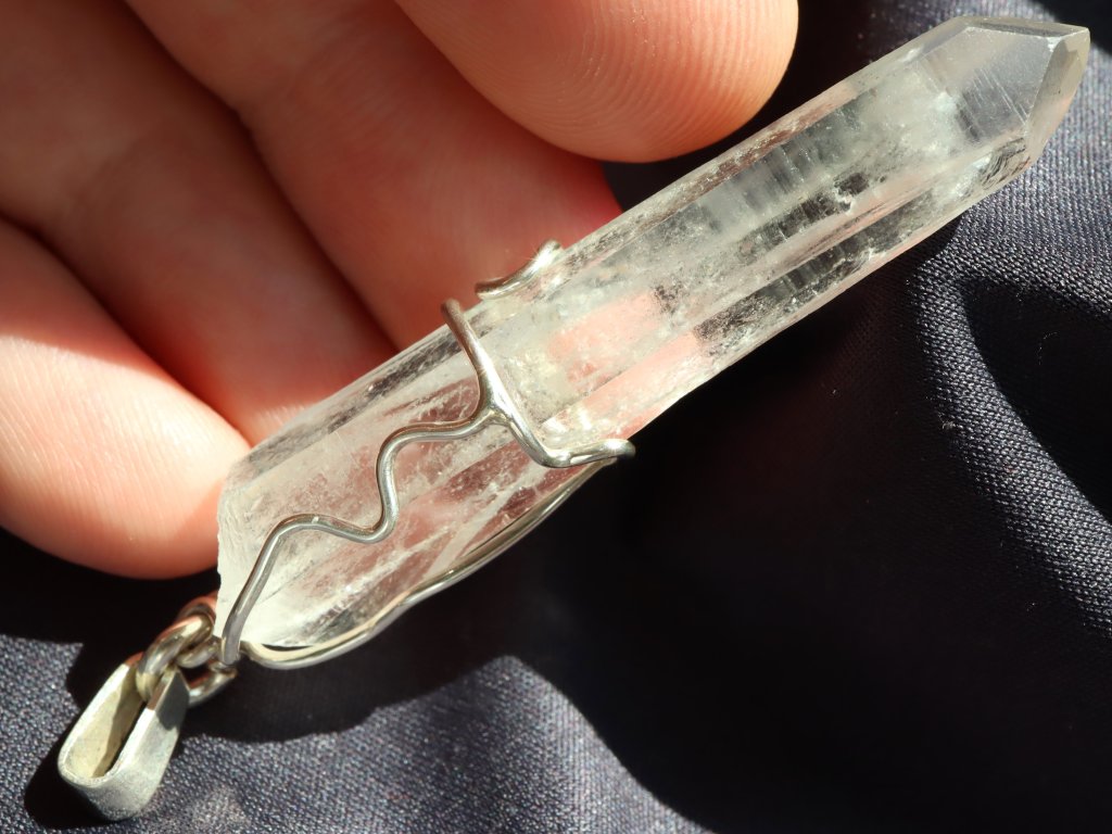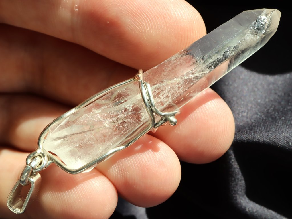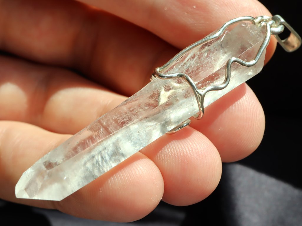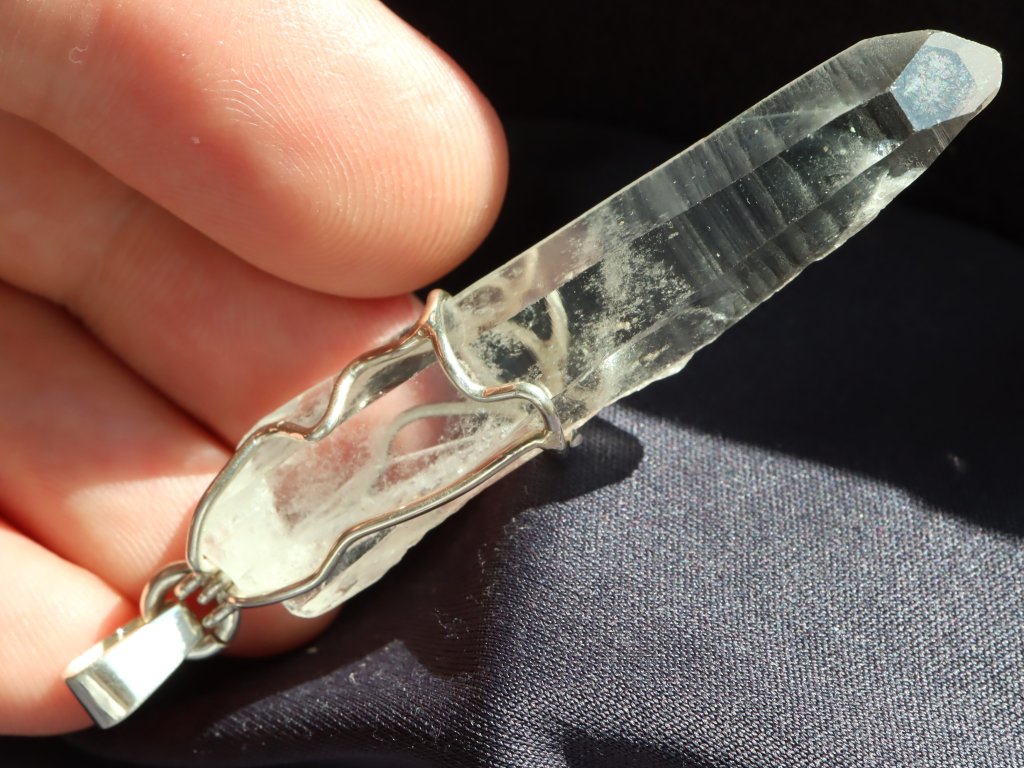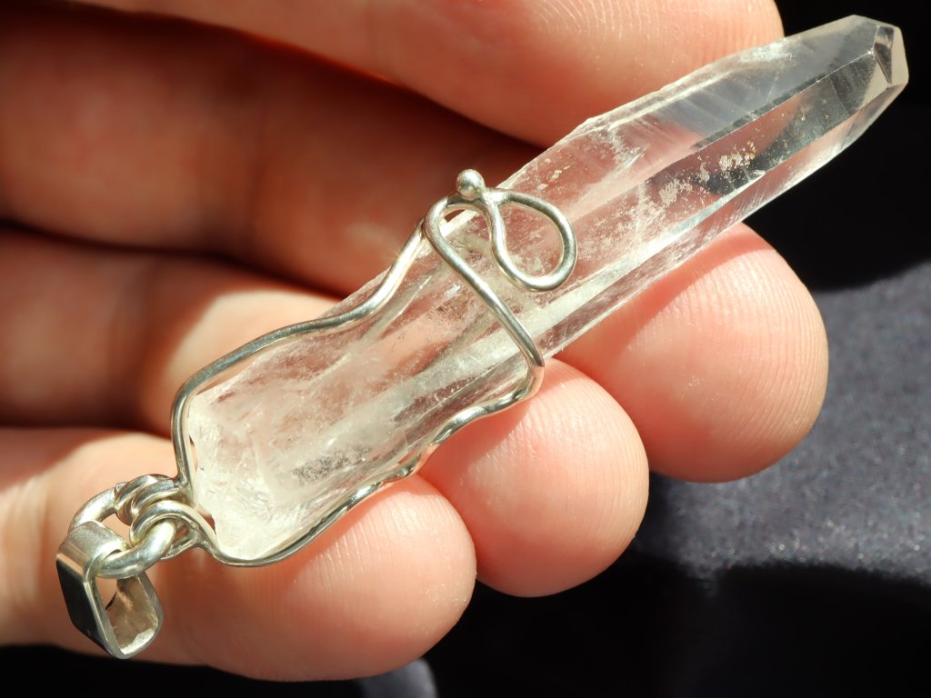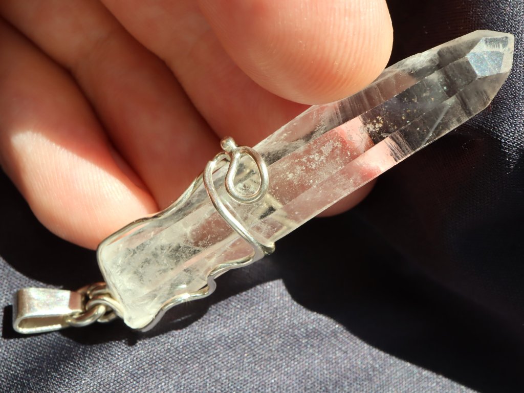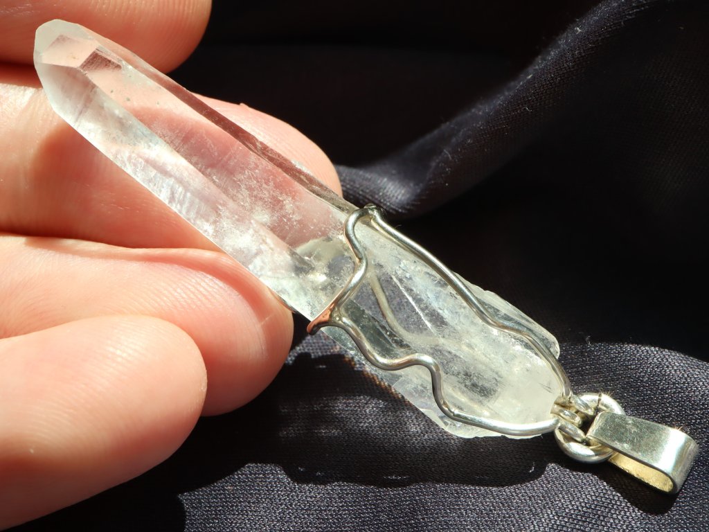 Přívěsek ukrývá fantastický pohlouhlý a úzký krystal křišťálu. Krystaly s tímto atypickým tvarem se mezi sběrateli označují jako "tužkové", protože svým tvarem připomínají právě tužku.