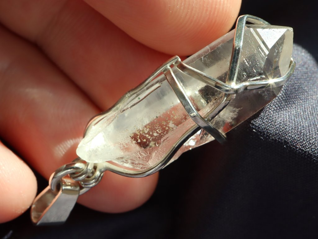 Tento originální ručně dělaný přívěsek se pyšní nádherným a kvalitním krystalem křišťálu, který má krásně zachovalé obvodové stěny se zajímavým otiskem a prakticky dokonalou špičku.