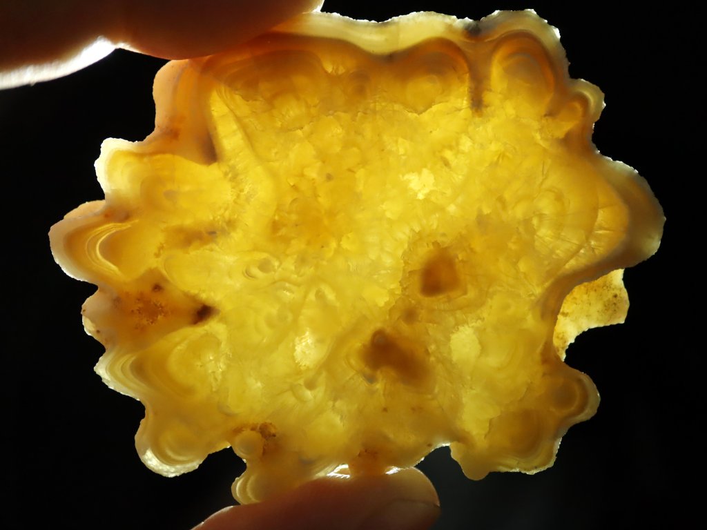Vzorek je sluníčkem či baterkou také skvěle průsvitný, což je dobře zachyceno na jednom ze snímků. Při prosvícení se aragonit rozzáří podmanivými žlutými odstíny.