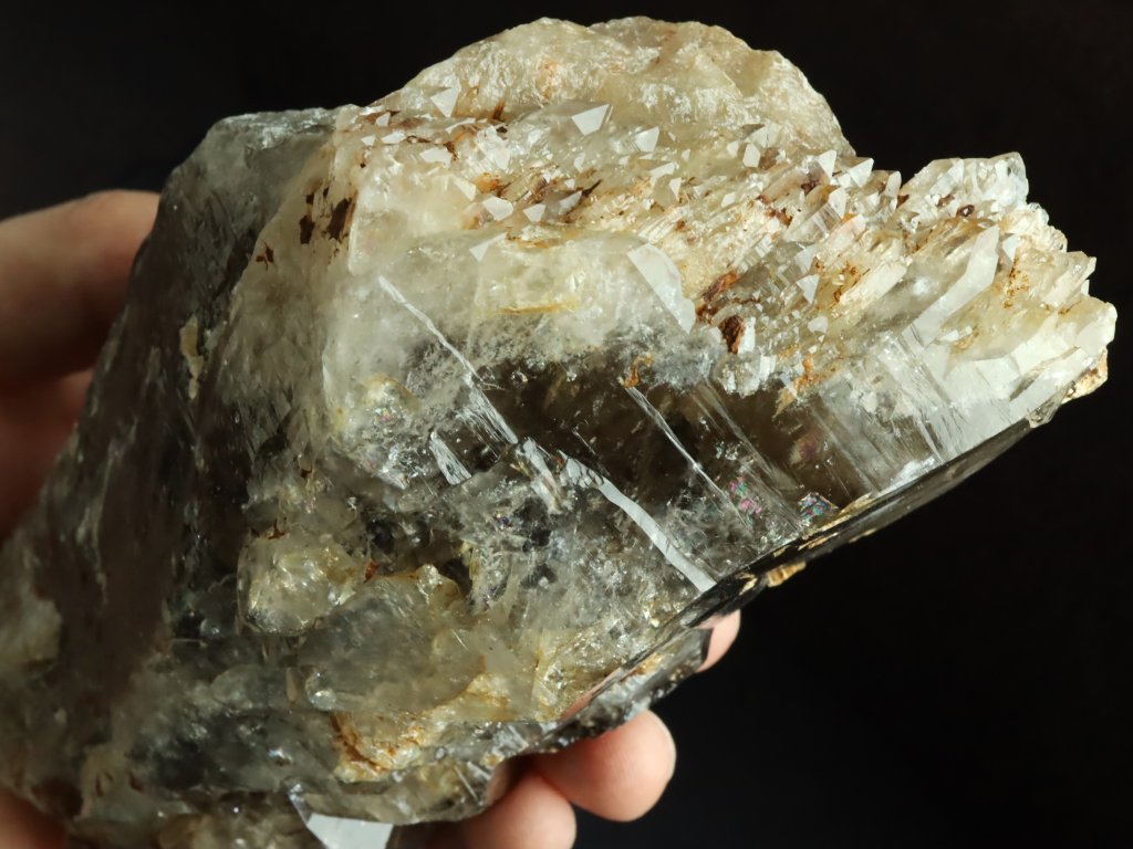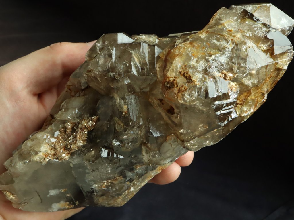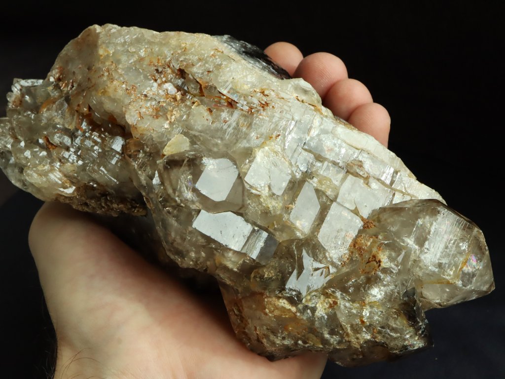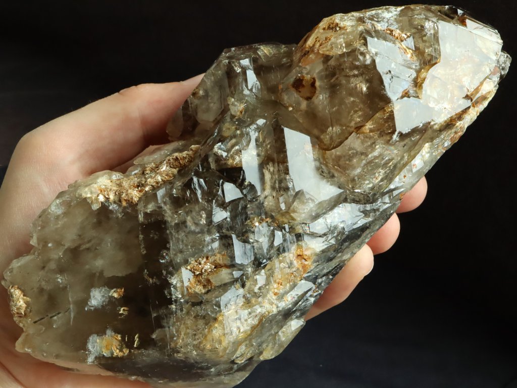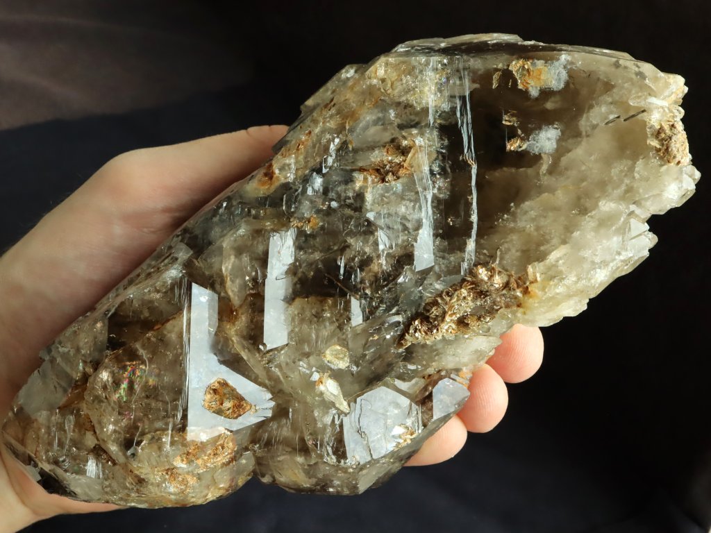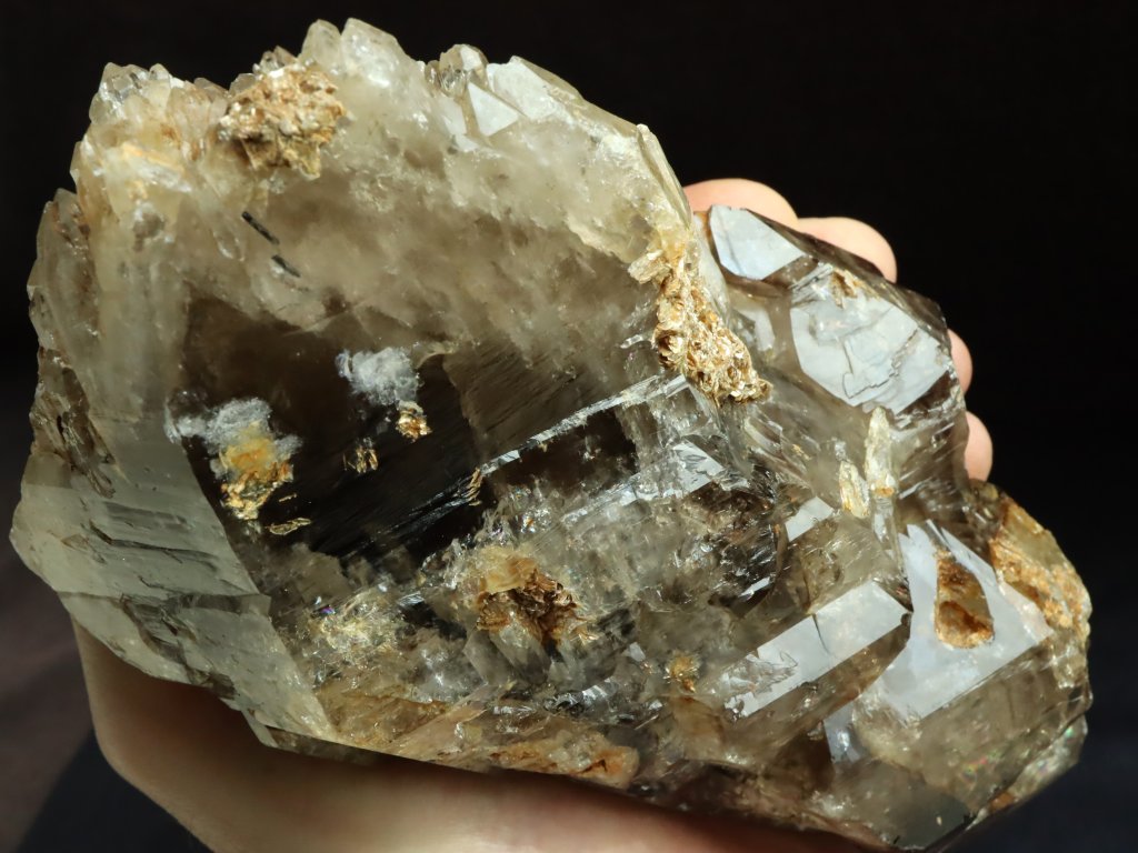 Spodní strana krystalu, kde záhněda místy částečně přechází až do křemene, na kterém byla původně / kdysy narostlá, pak můžete obdivovat fascinující úkaz v podobě tzv. dohojení. Krystal je zde takřka ze všech pohledových stran úžasně dohojený velikým množstvím drobounkých lesklých špiček. To jsme pro vás samozřejmě zachytili na několika detailních snímcích.