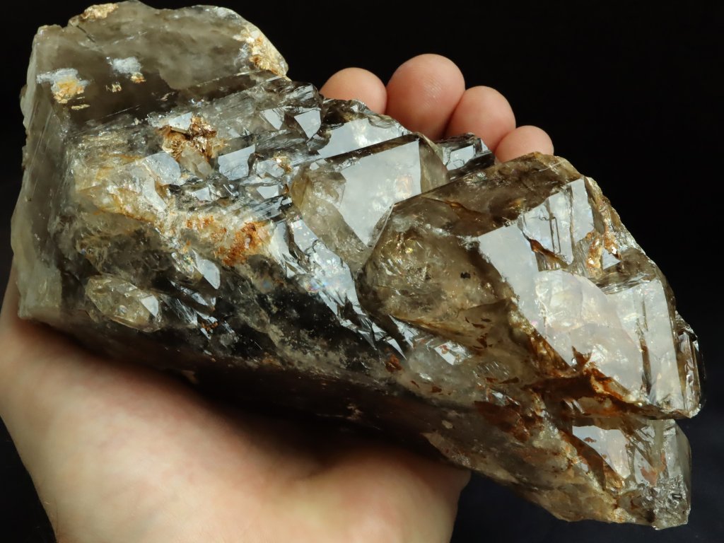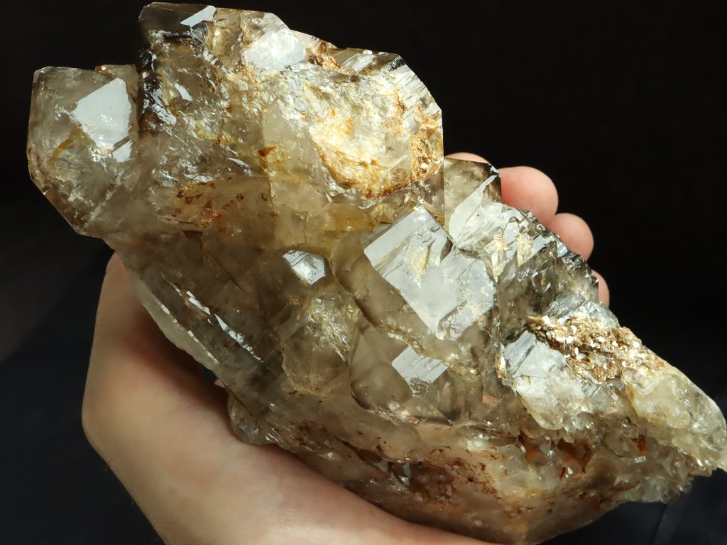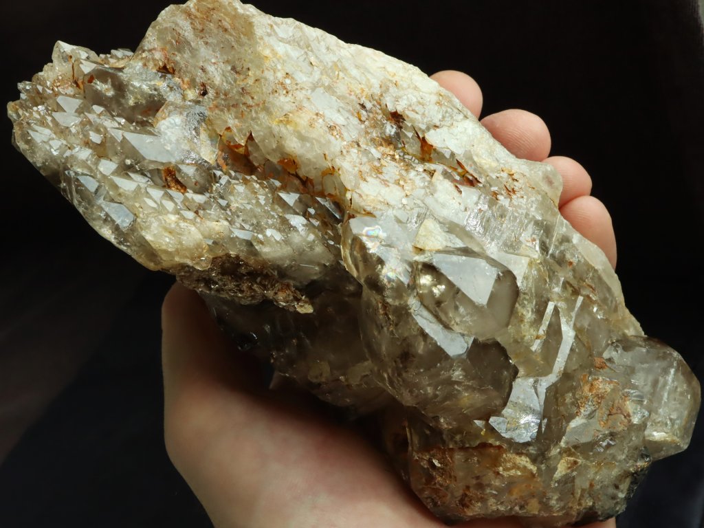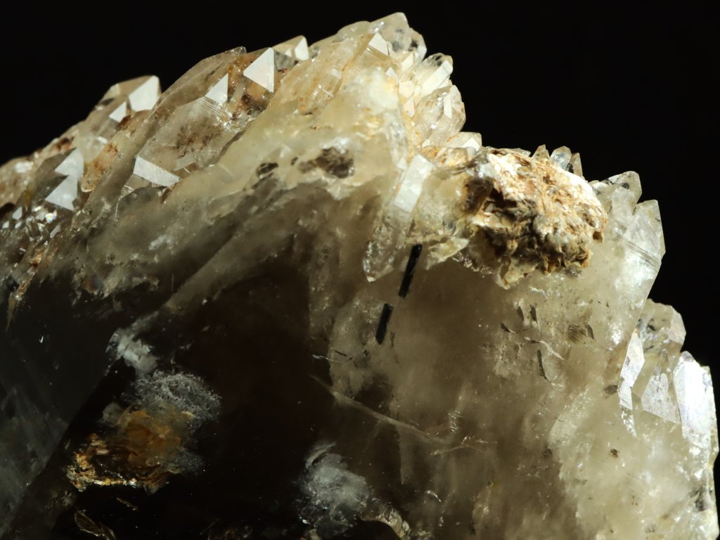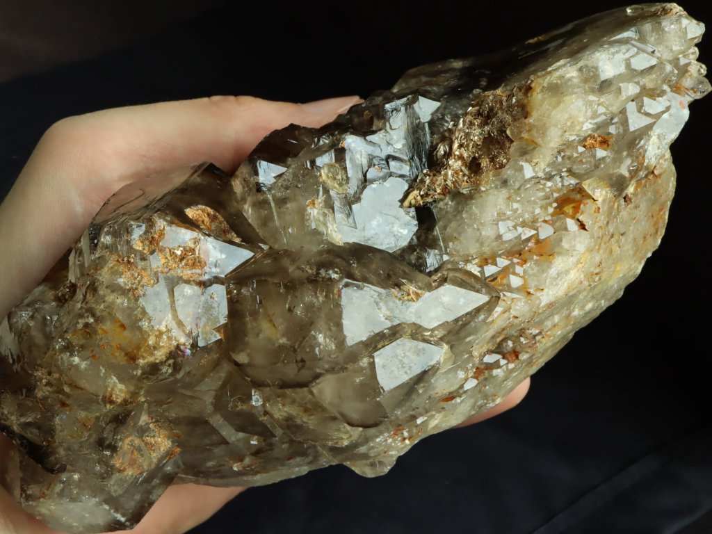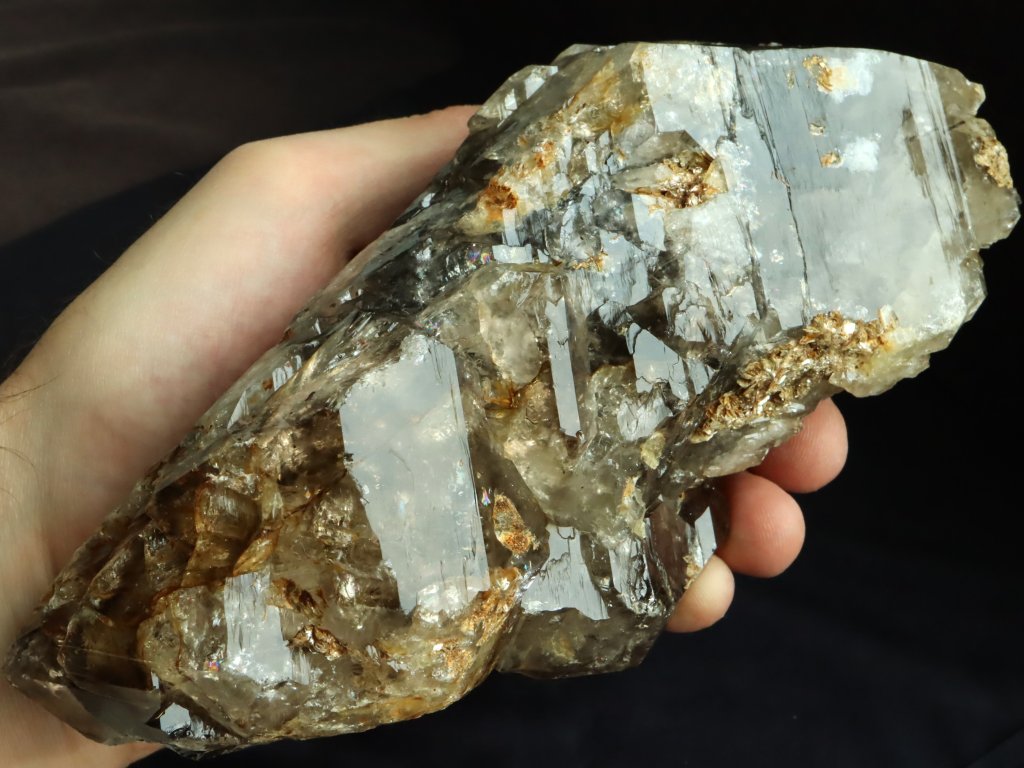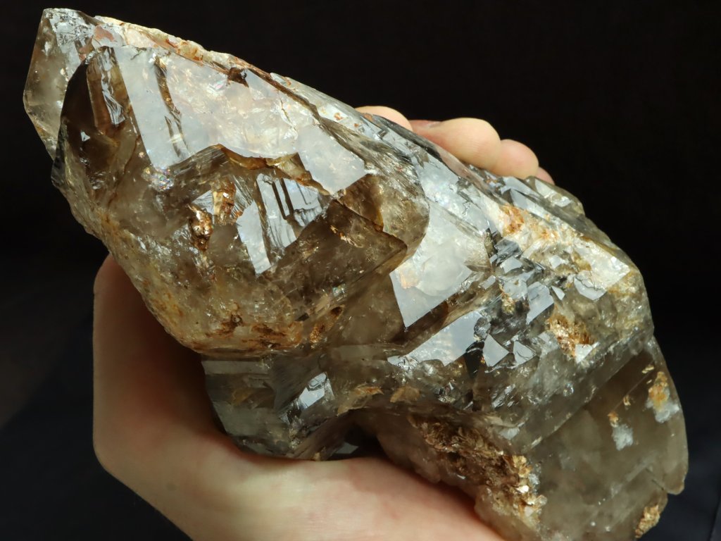 Spodní strana krystalu, kde záhněda místy částečně přechází až do křemene, na kterém byla původně / kdysy narostlá, pak můžete obdivovat fascinující úkaz v podobě tzv. dohojení. Krystal je zde takřka ze všech pohledových stran úžasně dohojený velikým množstvím drobounkých lesklých špiček. To jsme pro vás samozřejmě zachytili na několika detailních snímcích.