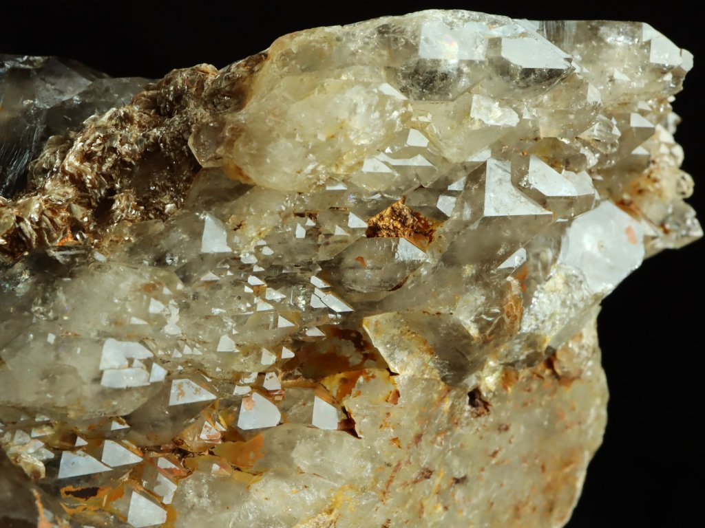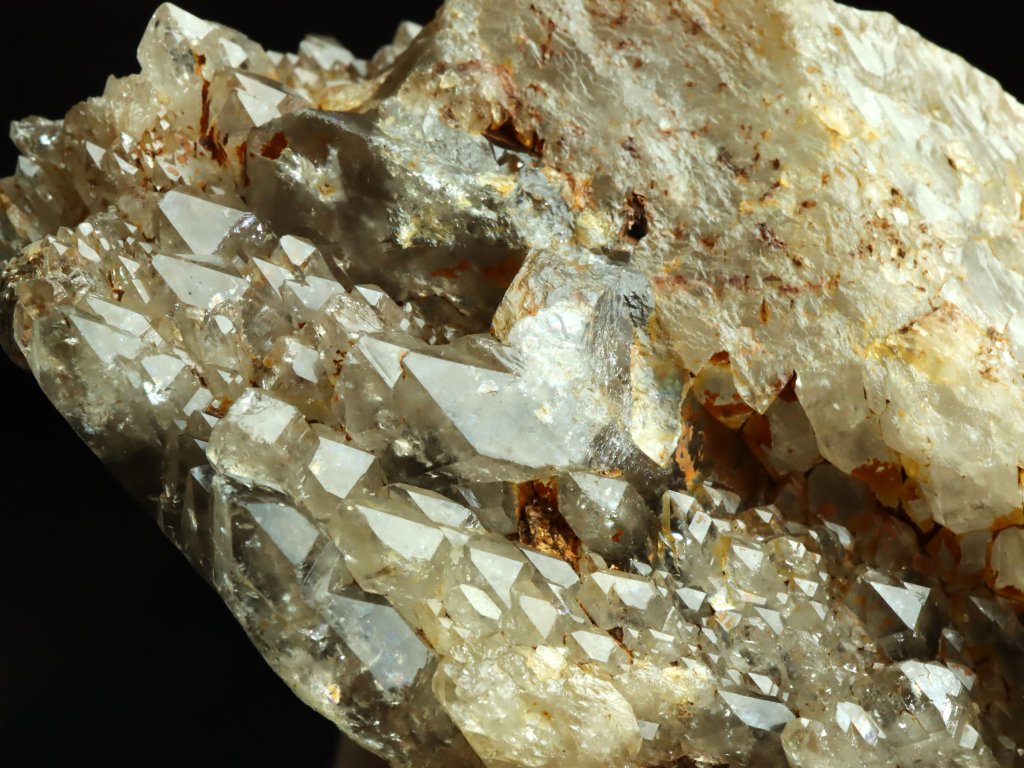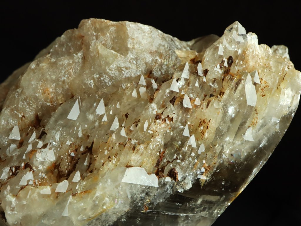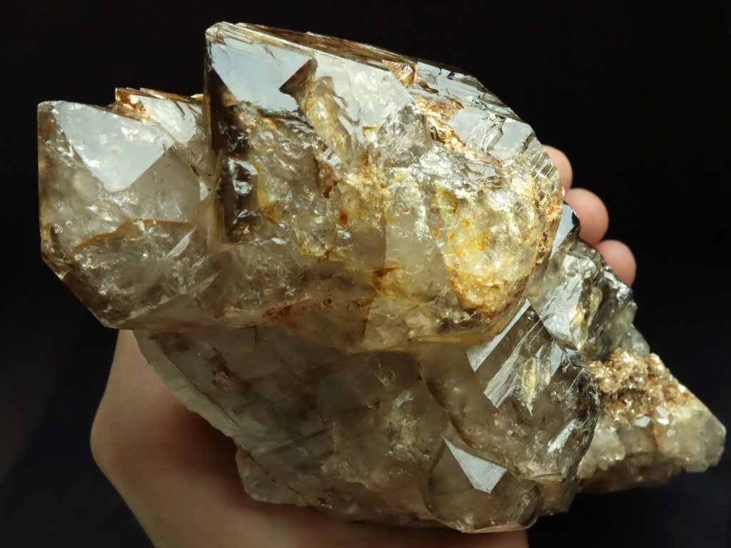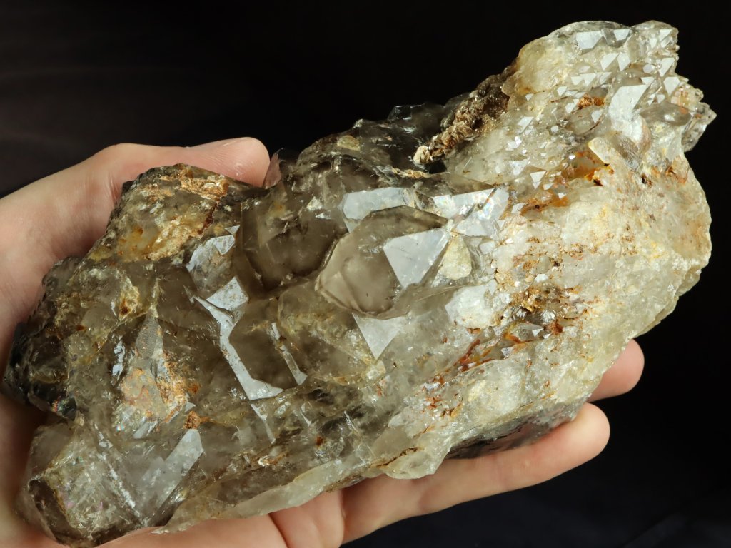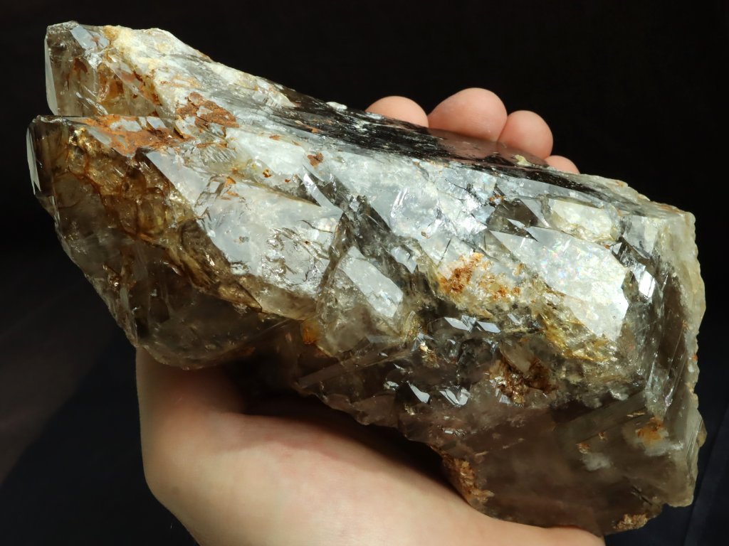 Spodní strana krystalu, kde záhněda místy částečně přechází až do křemene, na kterém byla původně / kdysy narostlá, pak můžete obdivovat fascinující úkaz v podobě tzv. dohojení. Krystal je zde takřka ze všech pohledových stran úžasně dohojený velikým množstvím drobounkých lesklých špiček. To jsme pro vás samozřejmě zachytili na několika detailních snímcích.