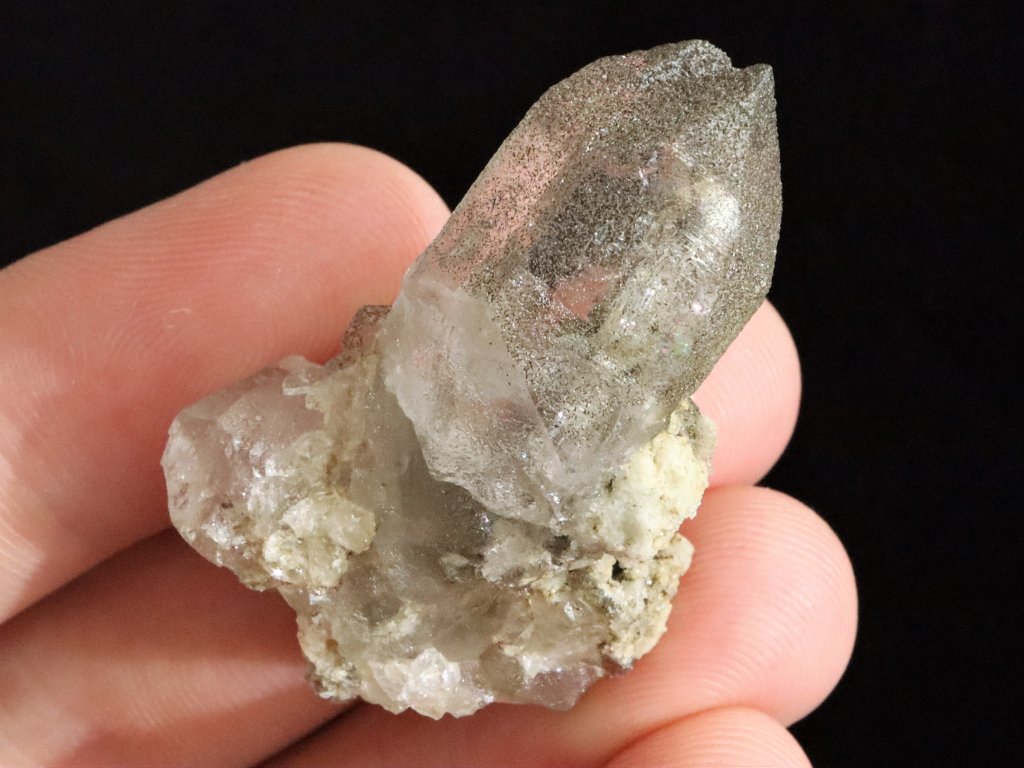 Menší krystal záhnědy pokrytý chloritem narostlý na podložce z albitu a křemene - Alpy