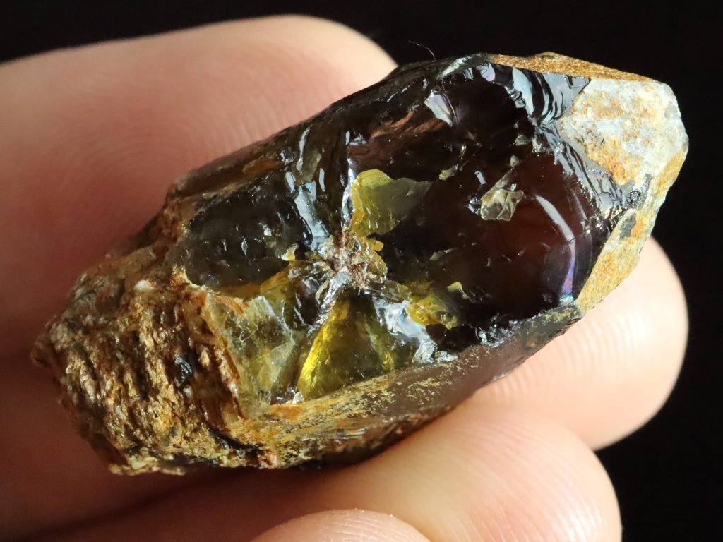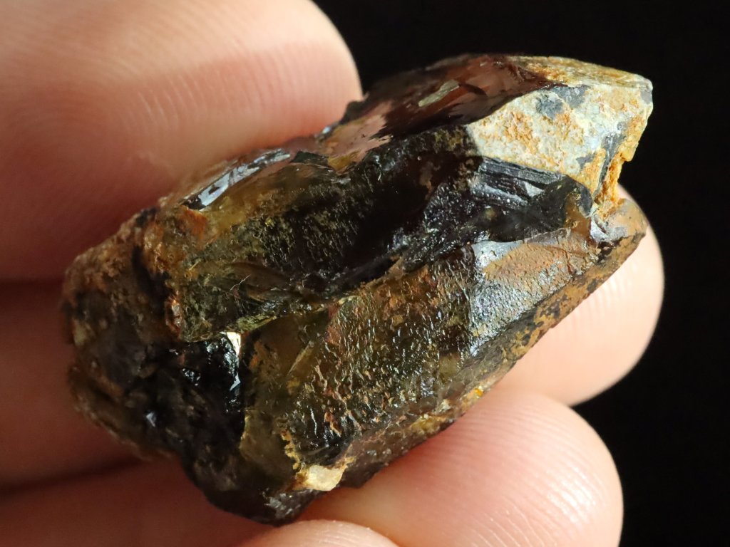 Menší krystalek / srostlice morionu s povlakem limonitu