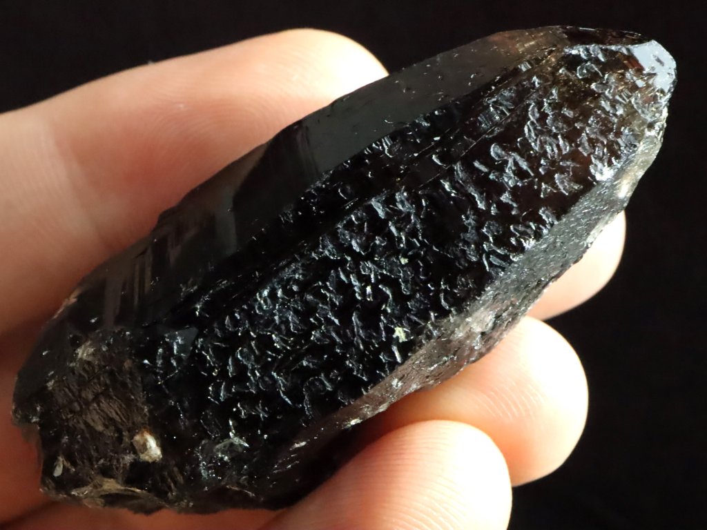 Jedná se o velmi atraktivní krystal morionu s délkou 6 centimetrů, který má krásně zachovalou špici i obvodové stěny. Krystal má samozřejmě nějáká drobná ťuknutí a v jedné pasáži je také decentně otlačený od okolní mateční horniny, jako celek však působí fantasticky a krásně zachovale.