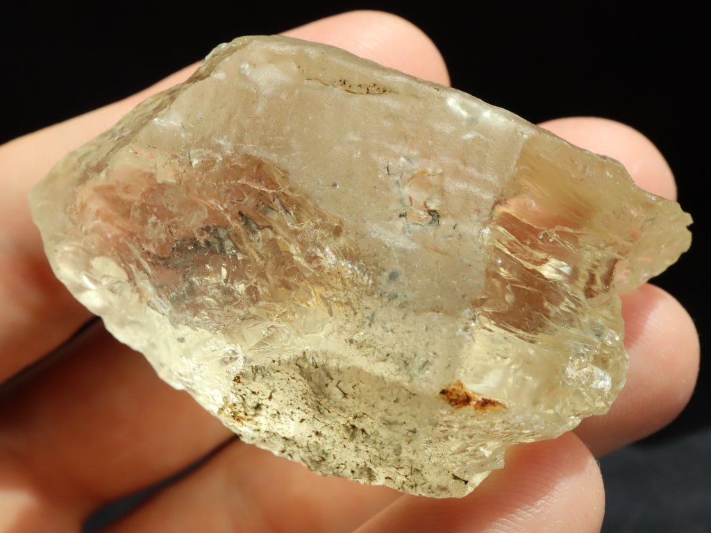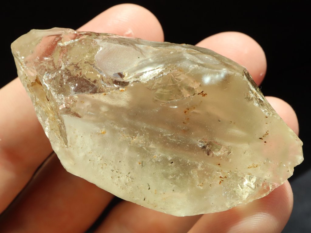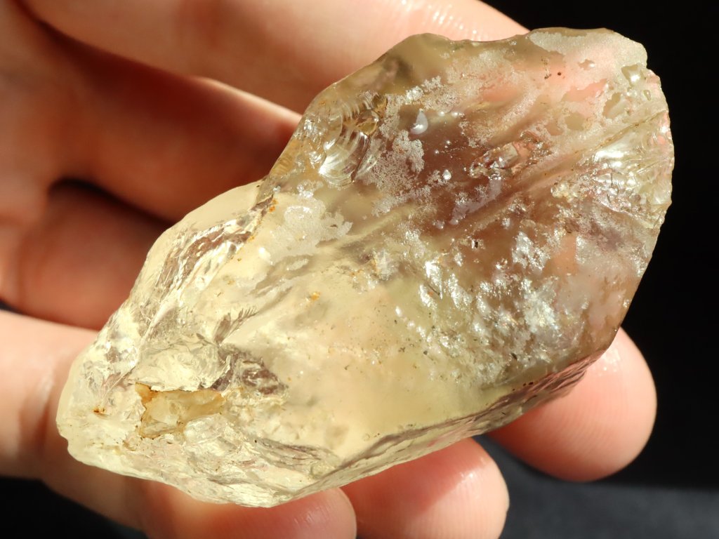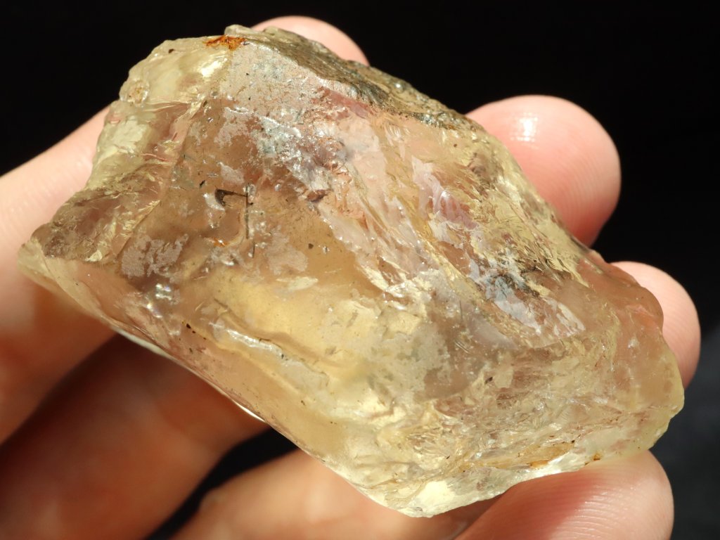 Citrín je (sluníčkem či baterkou) také celý výborně průsvitný. Povrch kombinující matný a lesklý povrch pak při prosvícení částečně dovoluje nahlédnout do vnitřního světa. Tam se ukrývá několik mlhovinových závojů a drobných peříček, celková čistota kamene je však velmi vysoká až drahokamová.