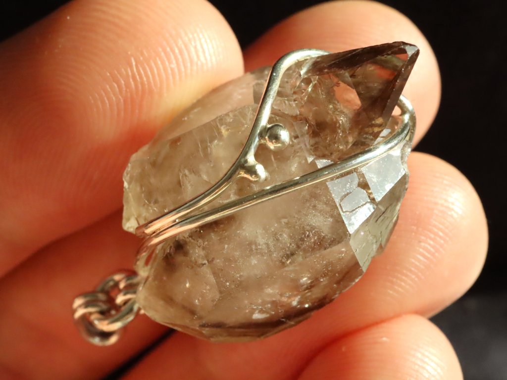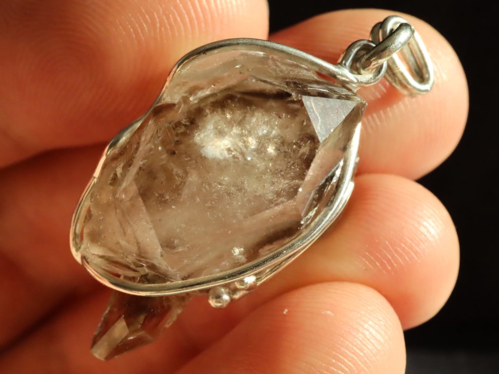 V tomto propracovaném a decentně zdobeném přívěsku se ukrývá vzácnost v podobě oboustranně vyvinutého krystalu záhnědy. Oboustranný znamená, že má špice na obou svých koncích.